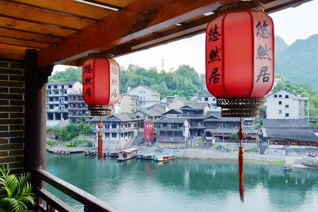 入住的客栈在河边,取名悠然居,听着舒服,与我来边城的心境相合。老板不是本地人,来自京城。割舍首都之繁华而隐于湘西一隅,中间不知有何故事。套房卧室很别致,家具皆含古风,仿古大床中央放着一本似乎翻旧了的《边城》,封面上还斜放着一枝小花。老板用了心思。相比之下,另一间房的布置完全没有章法。一张麻将桌孤立中间,靠墙一排椅子随意摆放,一种杂物间的感觉立刻就冲淡了原本精致的氛围。一间套房,两个世界,老板有点虎头蛇尾。