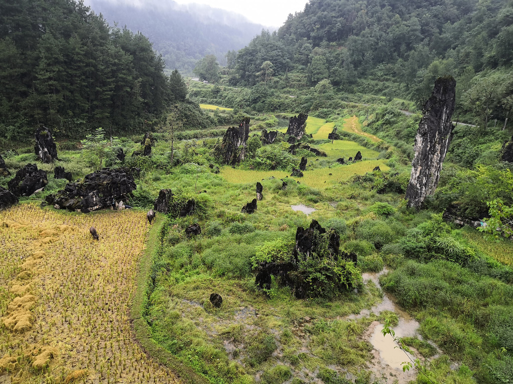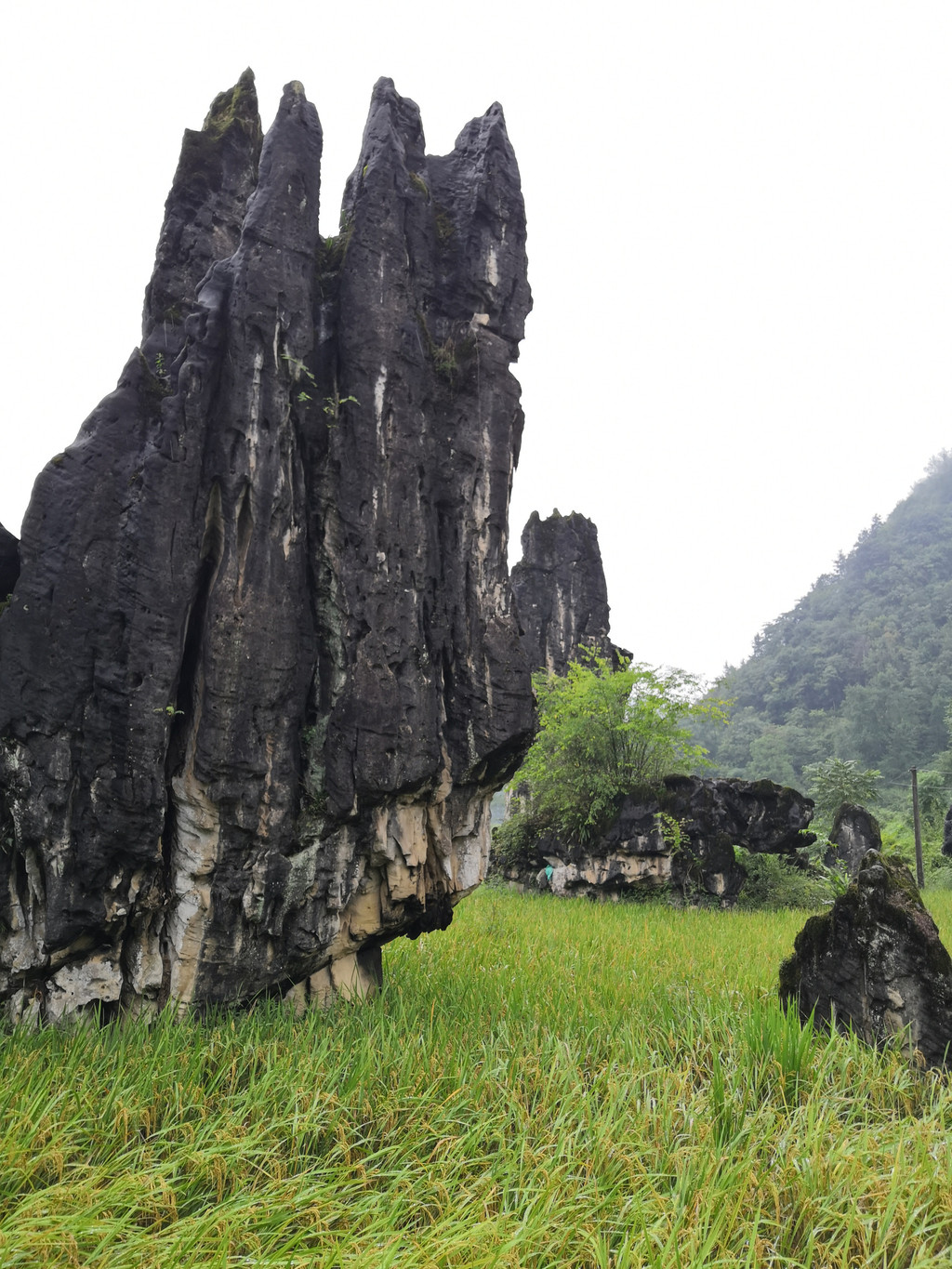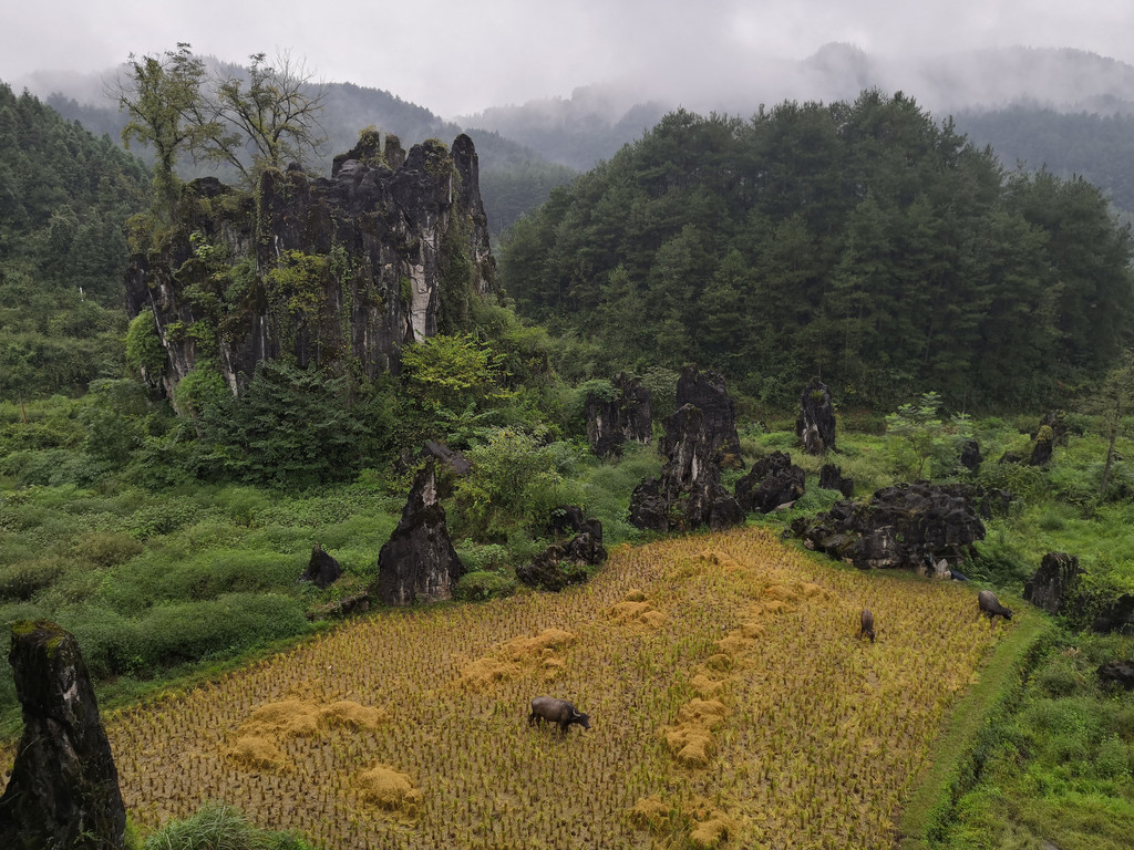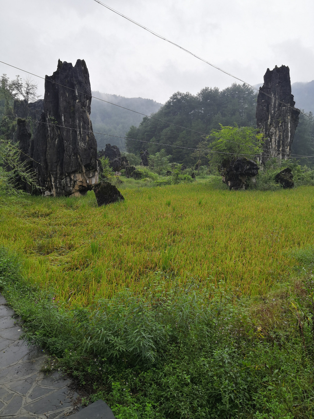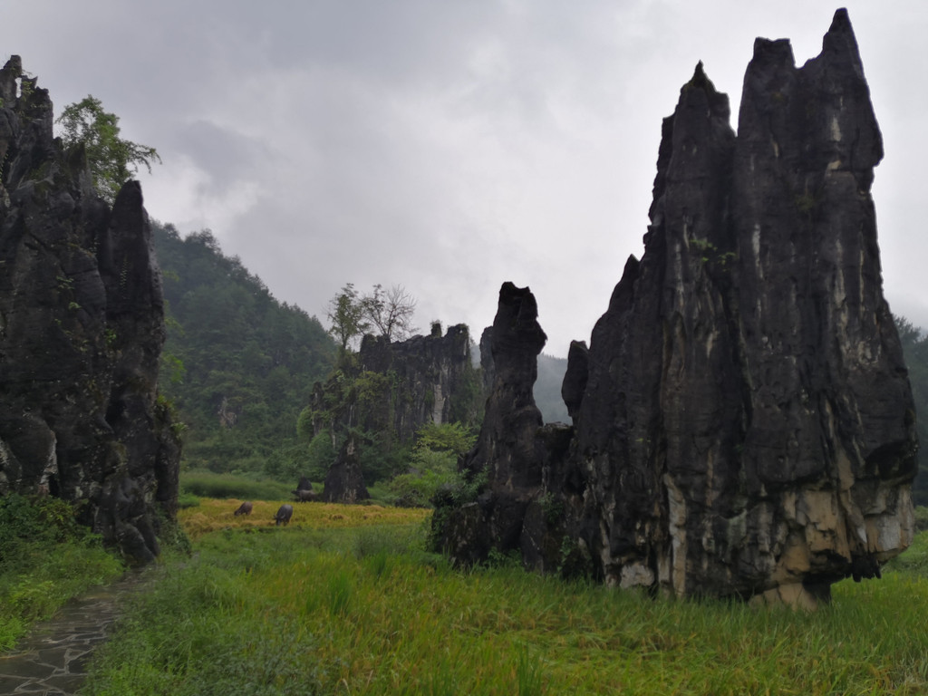 座座峋嶙巨石千姿百态、造型奇特。更与别处不同的是石柱群的脚下是大到几分、小到几厘的农田,灌田的小水渠弯曲盘沿,潺潺有声。金黄色的稻田,映衬着黝黑的石林,牛儿在田野里悠闲地吃着草,使人分不清是在天上还是在人间。