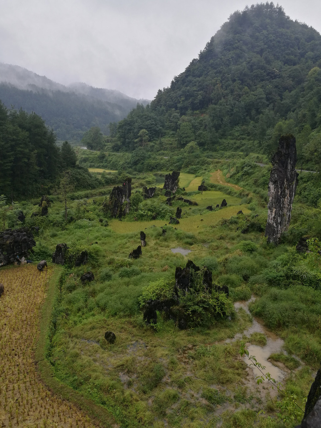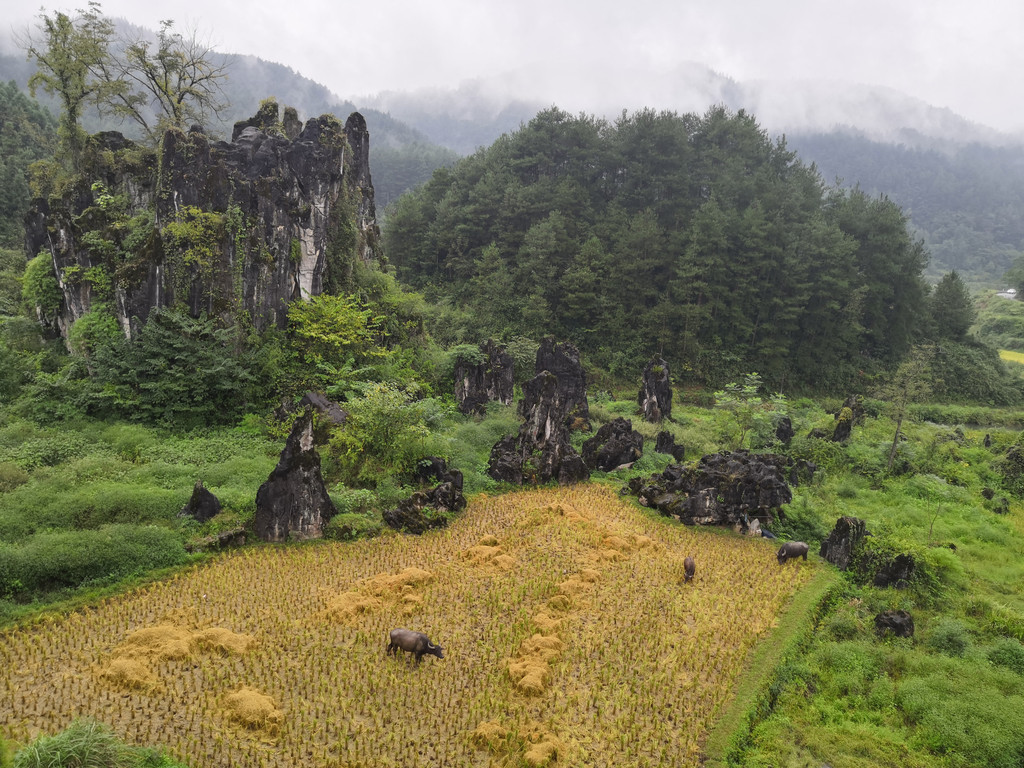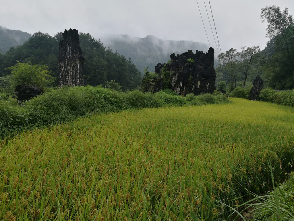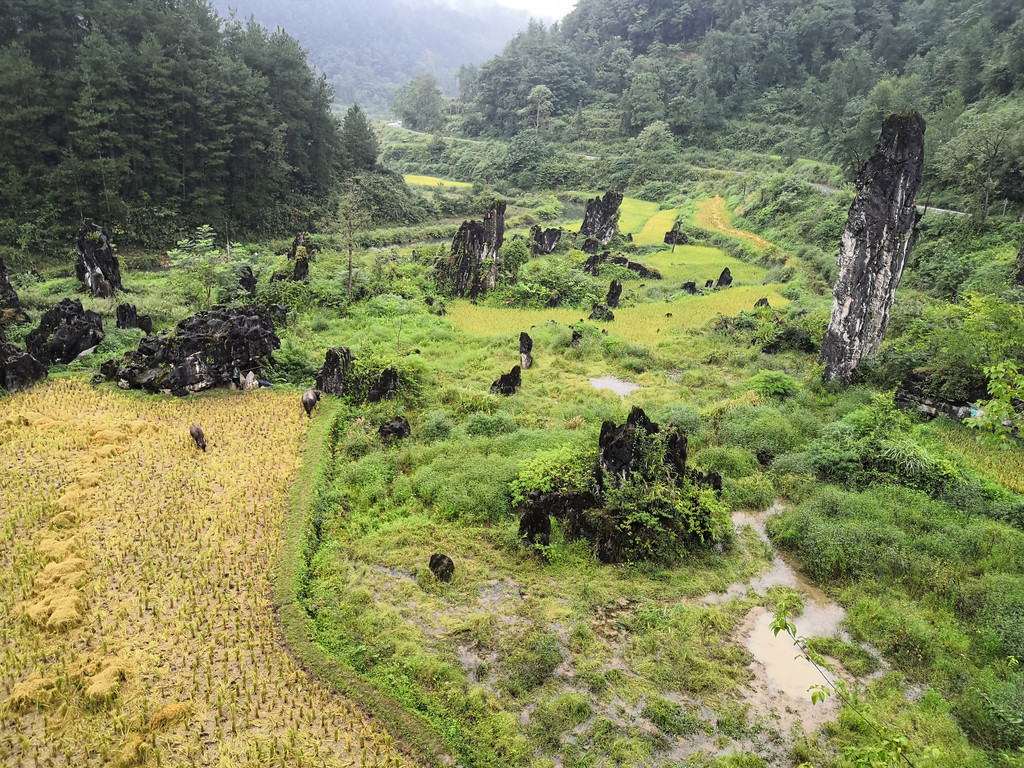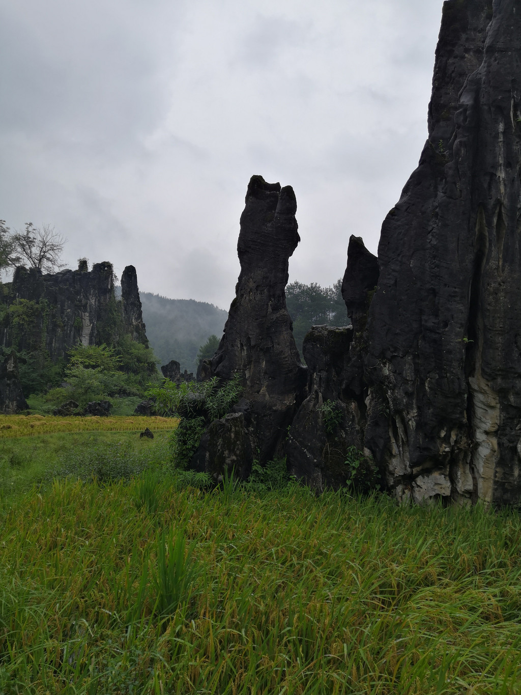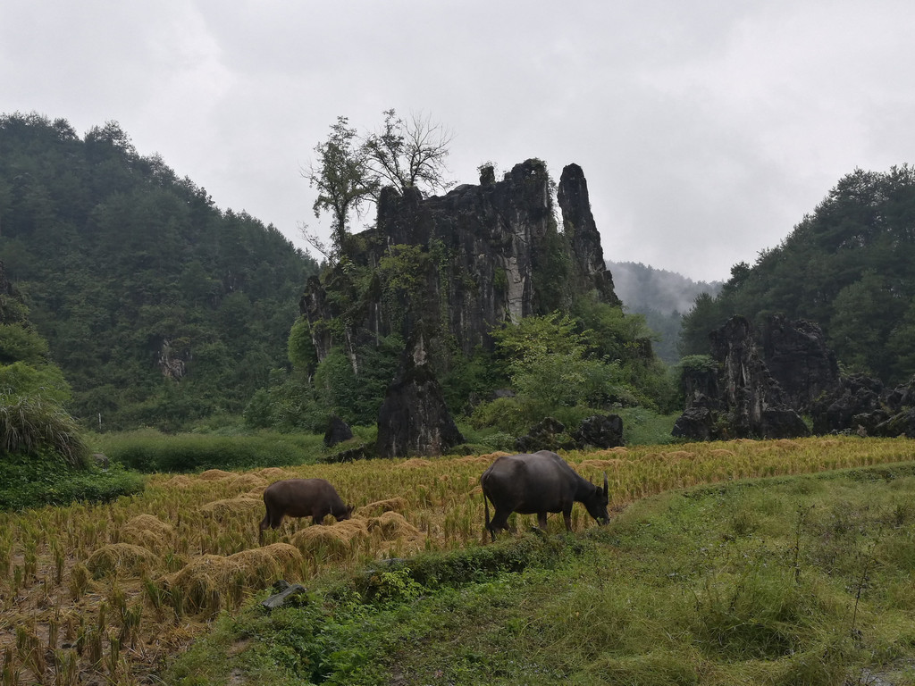 座座峋嶙巨石千姿百态、造型奇特。更与别处不同的是石柱群的脚下是大到几分、小到几厘的农田,灌田的小水渠弯曲盘沿,潺潺有声。金黄色的稻田,映衬着黝黑的石林,牛儿在田野里悠闲地吃着草,使人分不清是在天上还是在人间。
