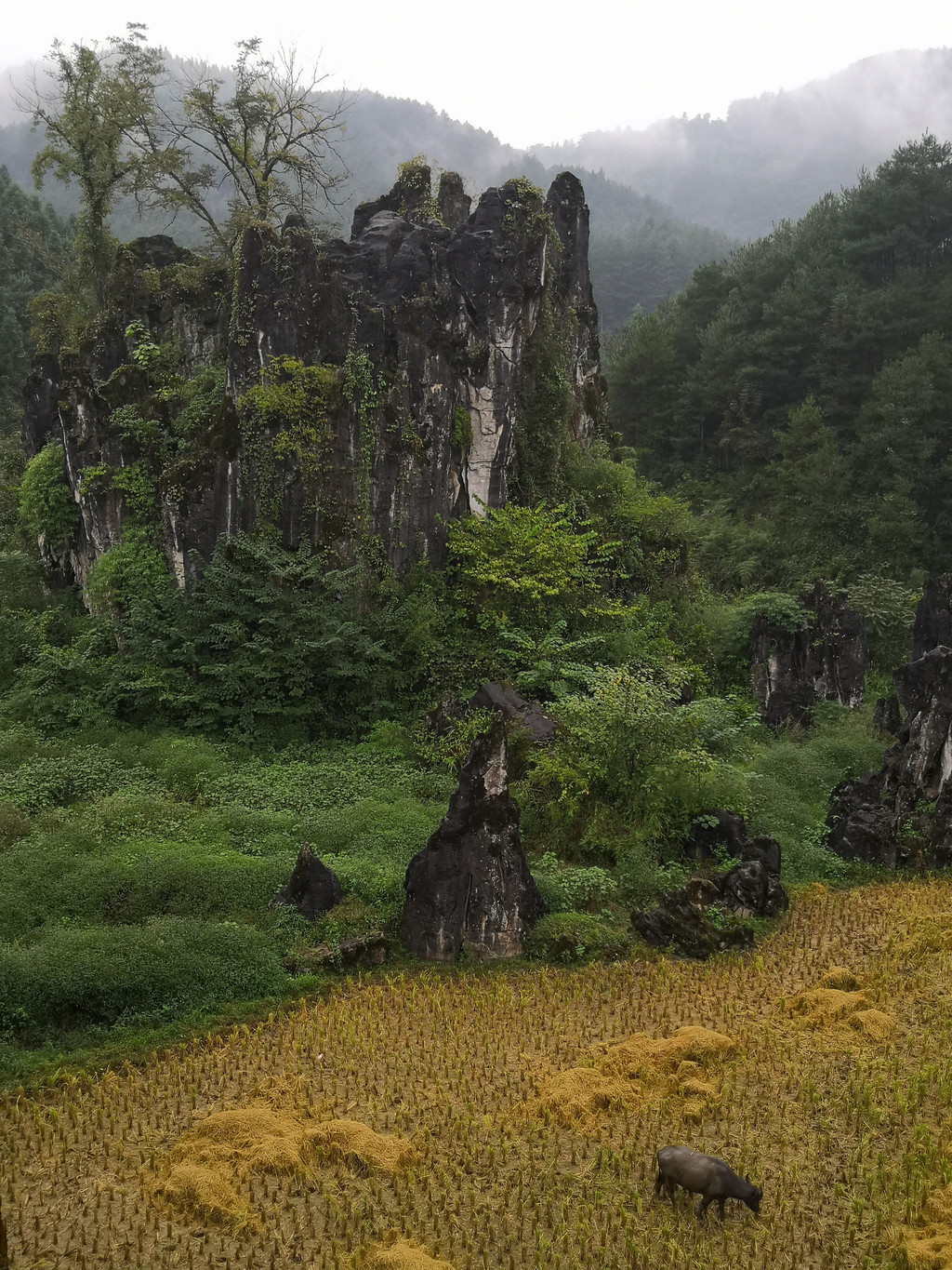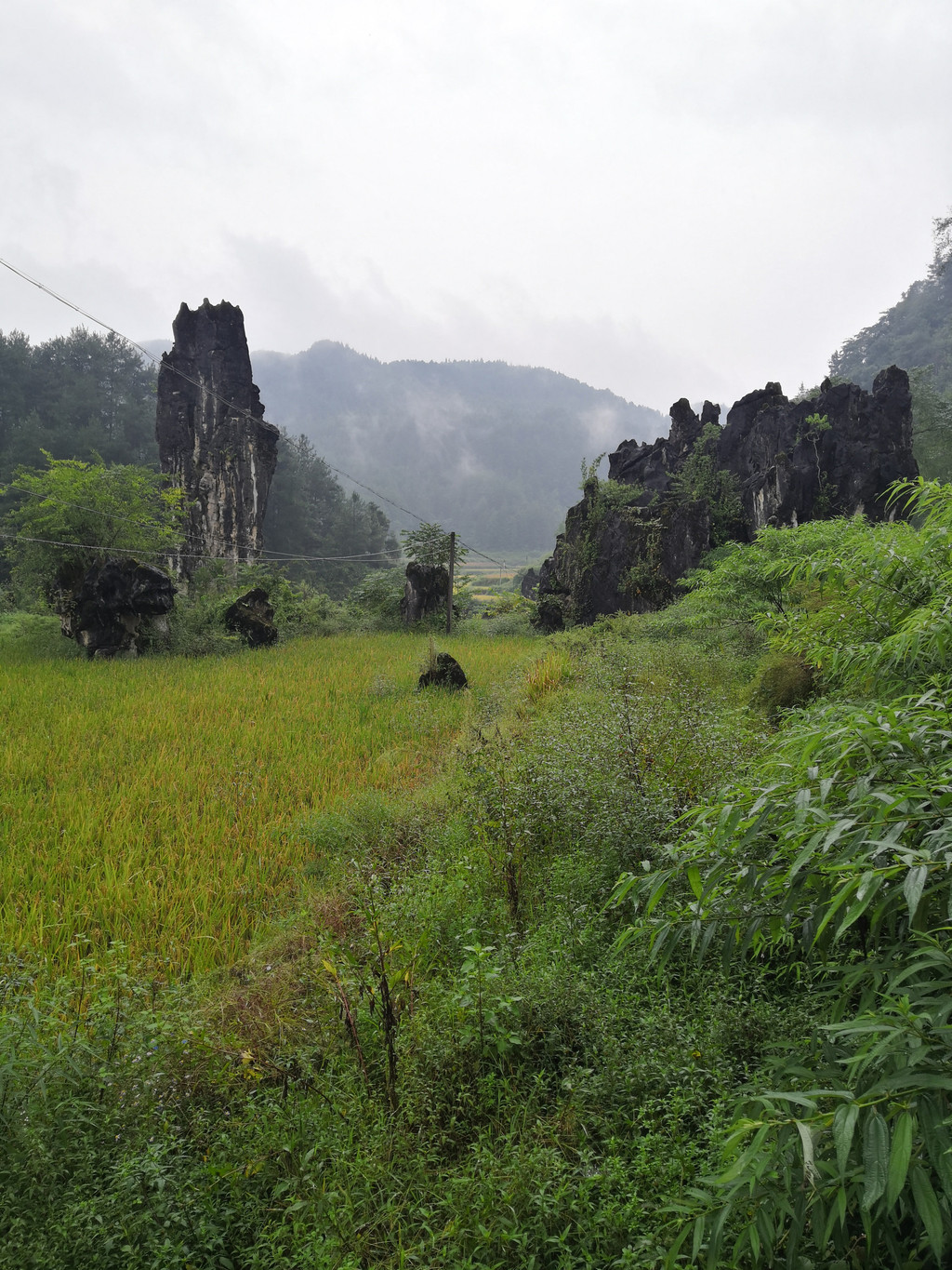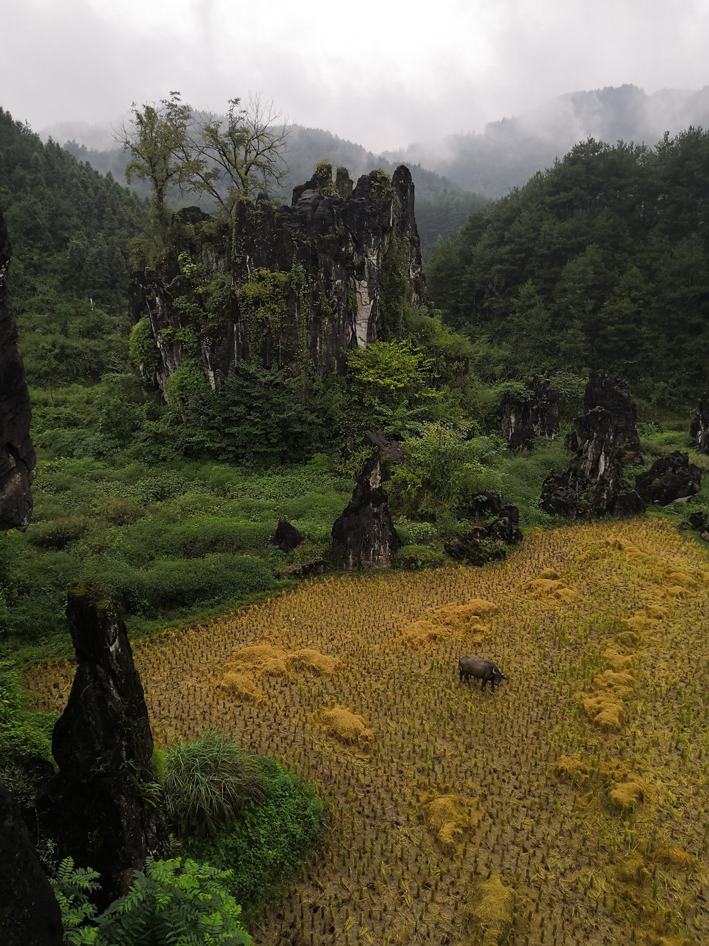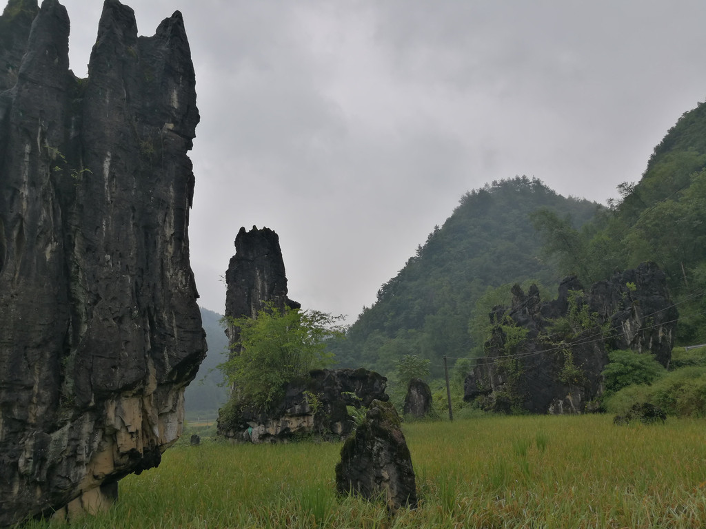 座座峋嶙巨石千姿百态、造型奇特。更与别处不同的是石柱群的脚下是大到几分、小到几厘的农田,灌田的小水渠弯曲盘沿,潺潺有声。金黄色的稻田,映衬着黝黑的石林,牛儿在田野里悠闲地吃着草,使人分不清是在天上还是在人间。