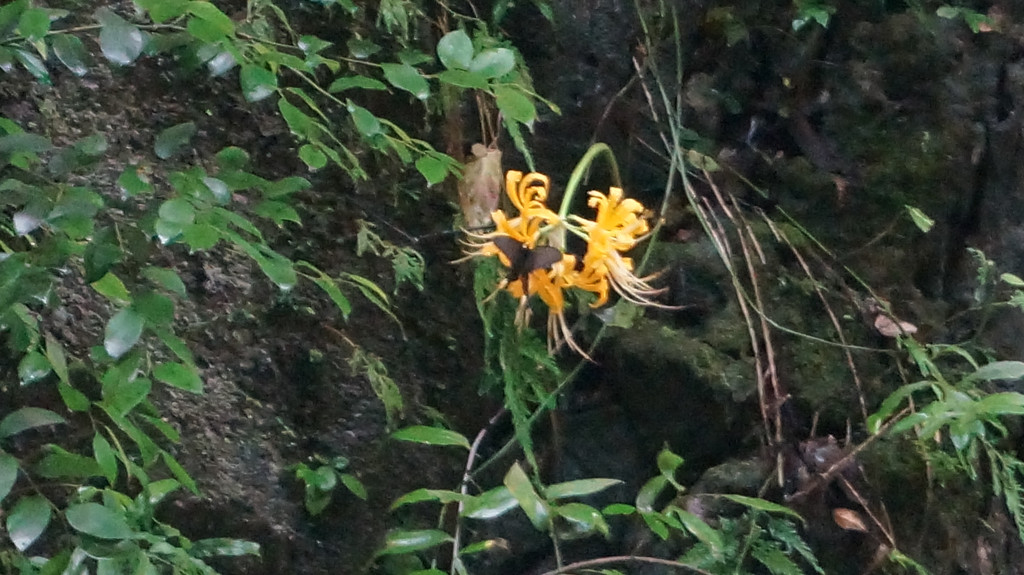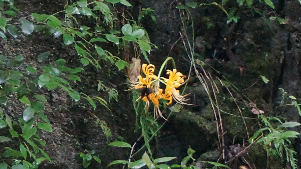 峡谷对面的峭壁上,星星点点的嫩黄色吸引我们的目光,用长焦拉近一看,原来是正在盛开的野生兰花。