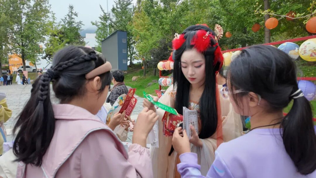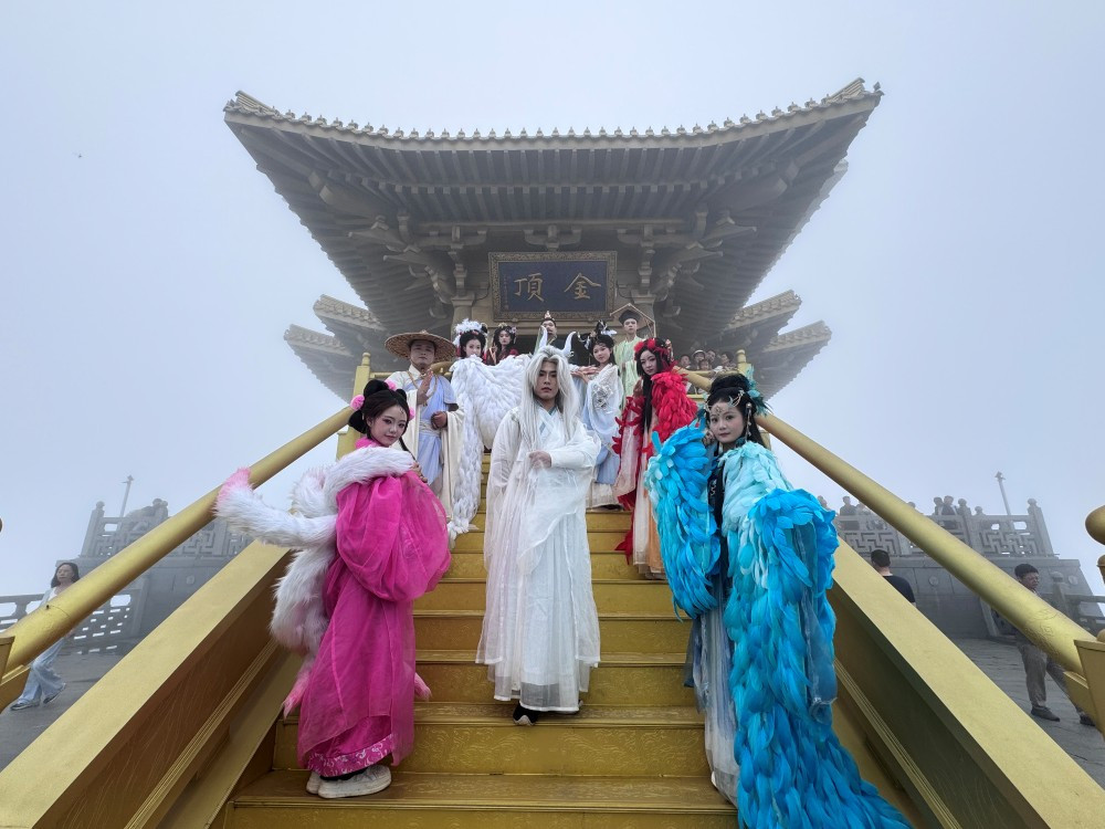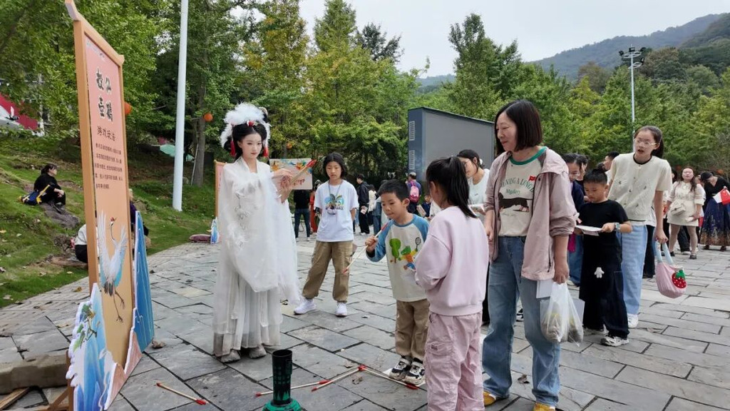 在宝珠峰金顶处极目远眺,层林尽染的山峦如巨幅油画在眼前铺展,鎏金般的银杏与苍翠的松柏交织错落,山谷间云海轻涌,恍若仙境。从金顶下来,来到银杏广场,“朱雀解谜”“白龙蹴鞠”等趣味游戏成为亲子家庭的首选,大人小孩组队闯关,笑声与欢呼声此起彼伏,参与互动的游客还能集章兑换专属“银票”,为后续活动攒下“惊喜筹码”。“这里不仅风景好,各种沉浸式互动游戏让人体验感满满,我们家小朋友玩得不愿意走。”武汉游客张先生说,“我们一家四口计划在这里玩3天。”