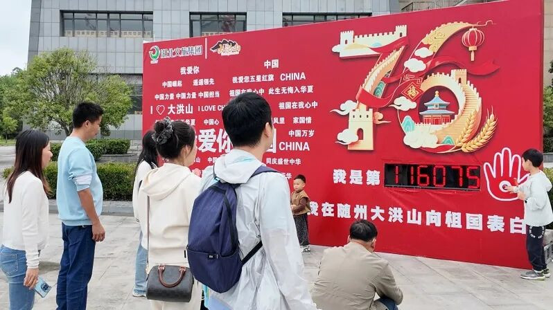走到游客中心大门口,浓郁的国庆氛围就扑面而来,设置的国庆打卡点成了游客们的“必拍之地”。红通通的打卡墙鲜艳夺目,墙上“我爱你中国”“此生无悔入华夏”的字样格外醒目,每一句都戳中人心,看得人热血沸腾;随风飘扬的国旗点缀其间,细节感直接拉满。