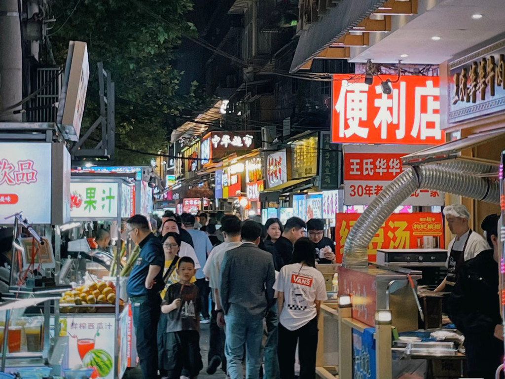 夜幕降临,直奔万松园美食街,这里是武汉的美食聚集地。街道两旁灯火通明,各类美食店铺香气扑鼻,秋日的烟火气在此达到顶峰。