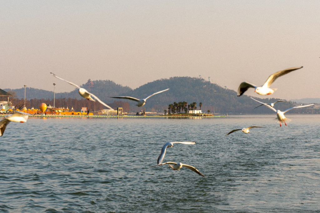 晨光中的东湖,宛如打翻的调色盘。水杉林渐渐染上橙红,与亭台楼阁相映成趣,坐在湖边的长椅上,看白鹭掠过水面。眼前是树叶洒下斑驳光影,耳边是风声与鸟鸣,惬意又治愈。