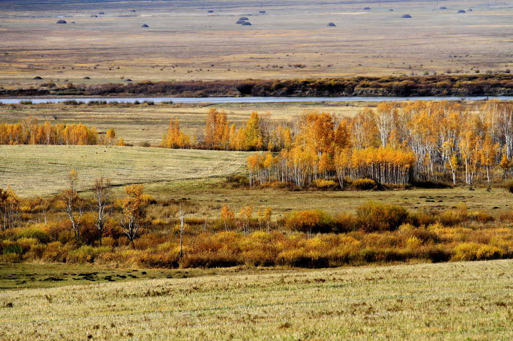 呼伦贝尔的秋天是令人向往的,秋天的金黄色铺满了整个大地,广袤的草原,落叶松都在秋天换上新衣服。这时候骑马驰骋在大草原上你会爱上呼伦贝尔。