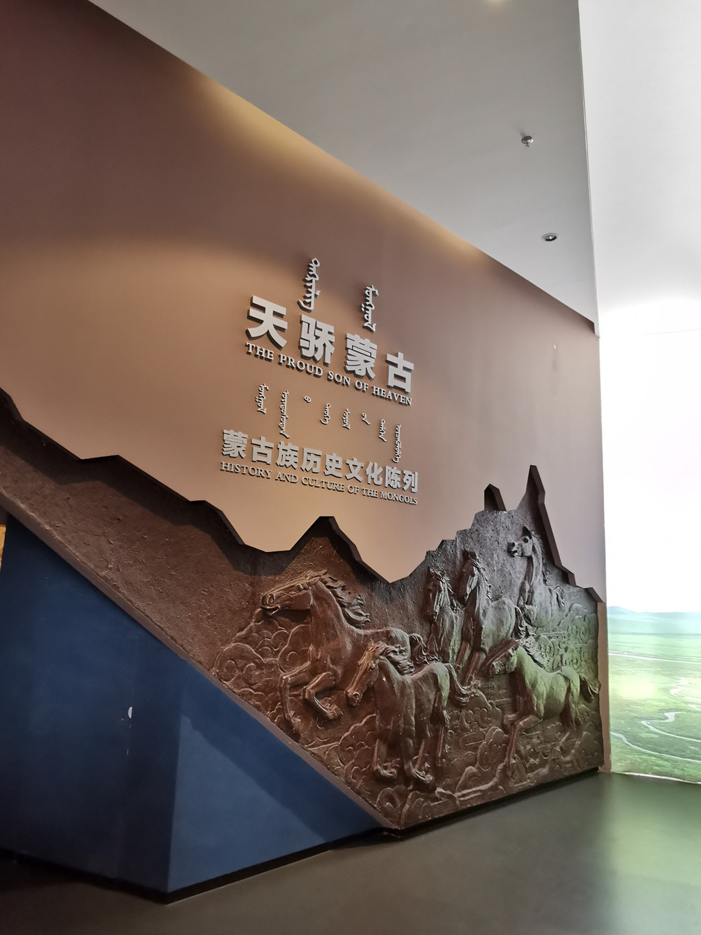 博物院有四层,首层在下面,展示从第二层开始,二层的“远古世界”、“高原壮阔”、“地下宝藏”、“飞天神舟”四个基本陈列介绍草原文化的生成之地;三层“草原雄风”、“草原天骄”、“草原风情”、“草原烽火”四个基本陈列以板块串珠形式展示草原文化从古代——近代——现代的纵向发展线条;四层“草原日出”、“风云骑士”、“草原服饰”、“苍穹旋律”、“草原华章”、“古道遗珍”六个专题陈列以亮点聚焦方式呈现草原文化。
