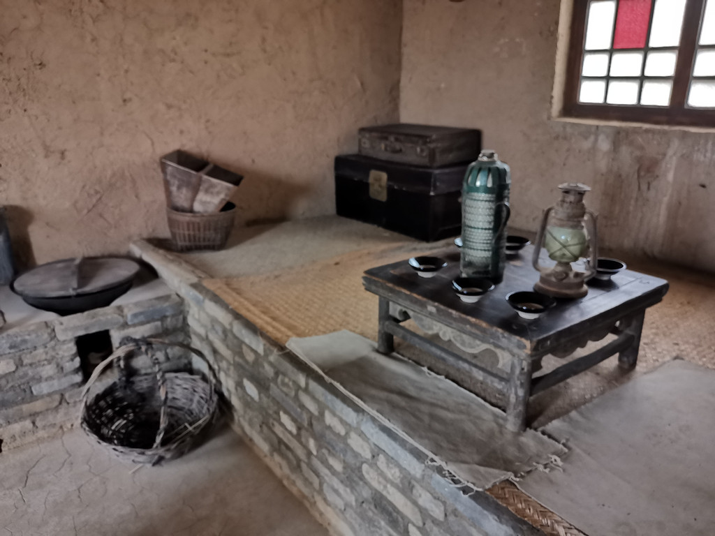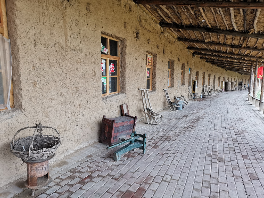 弯弯的长廊,门口是各种生产生活用具。