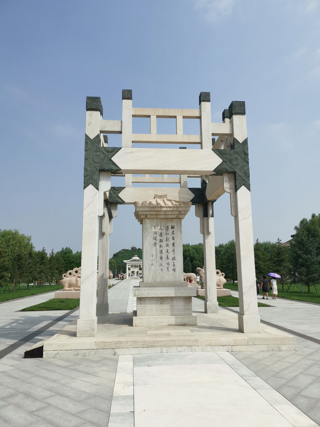 镂空亭内有昭君塑像,最后面即是青冢。神道两侧,石兽对立,威仪庄重,肃穆凛然。