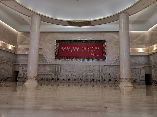 大厅墙上是总书记题的“建设美丽内蒙古 共圆伟大中国梦”。