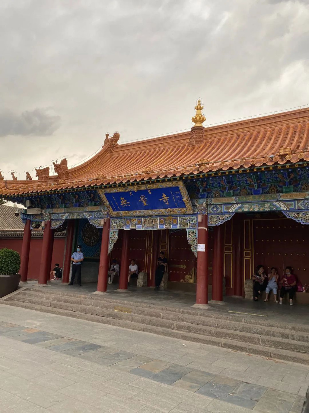 大召寺的前殿有点儿矮,感觉站在屋檐下,都能触摸到上面的牌匾,这比例与天高地阔的草原天地有点违和,或许天高地大,反倒觉得不需要建太高的屋子,或者为了避开这里常有的大风,又或者为了冬季保暖!问题太烧脑,不适合饭后思考,先搁置争议,继续前行。
