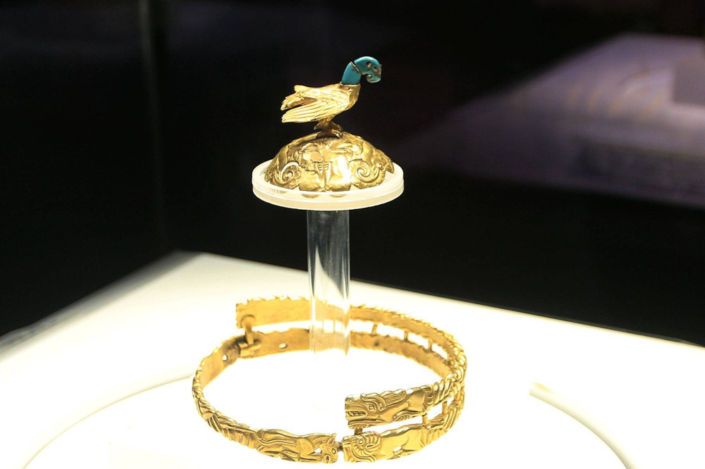 鹰顶金冠饰出自战国时期,是至今为止发现的唯一的匈奴单于的王冠。金色王冠上雕刻的龙栩栩如生,整个金冠看上去灿烂夺目,冠顶绿松石的鹰又尽显霸气。这里有远古生物的隐隐呼唤,这里有契丹王朝逝去的繁华,这里有许多宝藏等着人们来观赏,来呼和浩特记得打卡内蒙古博物院,开启一场深厚而激动人心的历史之旅。