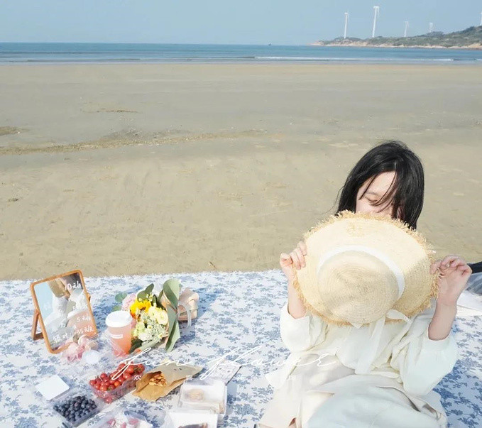 阳光明媚的日子,与朋友精心布置一场野餐,在海风清新,干净松软的沙滩上,吃着美味的零食,聆听着海浪的低语,感受风车的浪漫吧!在沙滩上野餐,小编建议大家使用浅色系的野餐垫,看起来会更清爽且有质感哦!