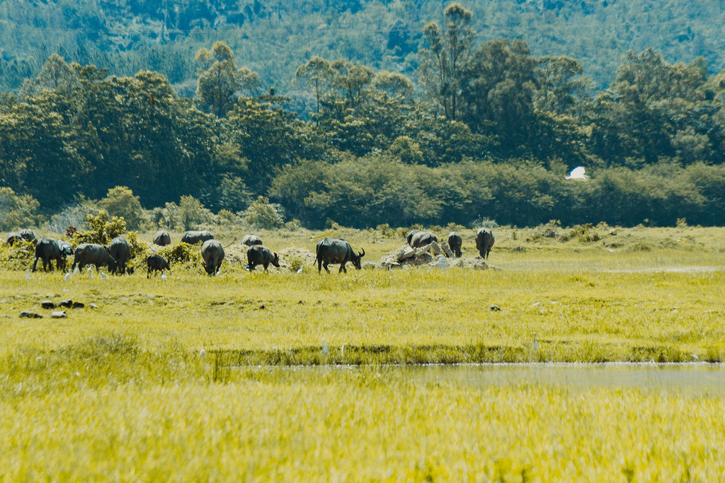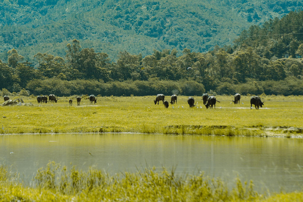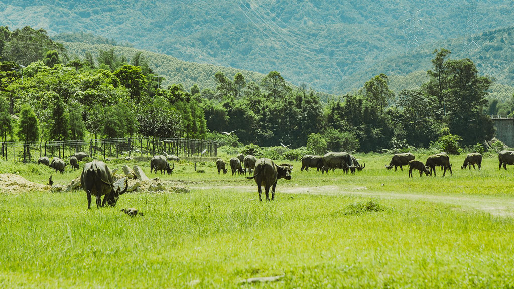 这是个季节性的草原,平时会被湖水淹没,只有有枯水期,湖底才会露出来,长满幼密的小草。我们到达的时候,草原上早已扎着十几个帐篷,想必是熟悉此地的驴友趁着周末过来露营。一直以为要到遥远的北方才能找到这种天苍苍,野茫茫的景色。谁也想不到广东竟然有这样的的秘境。一群白鹭在草原上飞来飞去,这真是一由于神奇的画面。走进去,仿佛置身于北方的大草原,眼前的青草和远处的树林,还有远山、蓝天白云构成一幅草原风光图。草原上还有一些废弃的破船,这些完成历史使命的船只,平时安静地躺在湖底,只有这个季节才能躺在草原上晒太阳,想必它的心情也和我们一样愉悦。草原上还是有一些沼泽,一群群的白鹭在浅水中嬉戏,如果你的车子不是越野车,就千万不要冒险开下来了。上面一些小河道也是极为清澈,清得可以倒映天上的白云,美得难以形容。在这么美丽的地方,来个法式野餐如何?好在我们早有准备,帐篷、野餐垫、鲜花、水果、面包……平时在网上看得到的,这次一样都没落下,全带出来了。这里不得不夸一下自家的车子空间够大了。各位集美们,如果想要随时都能拍出写真集级的照片,那平时一定要多做准备。因为最美的风景往往在你不经意路过的地方,很多在网上都找不到攻略的地方。各种拍照道具、服装都带在车上,只要在路上遇到好风景,随时都可以拍到惊艳的大片。帽子、墨镜等可以多准备,最好还有假花、篮子和百搭的手袋。小朋友也很喜欢这里,让小朋友多接触大自然确实是有很多好处。基本上,除了实在太晒,没别的毛病。远处是一大群水牛在吃草,隐隐约约还看到旁边有一大群白鹭。牛群的旁边是一大群白鹭,这种与牛相伴的白鹭叫牛背鹭,是唯一不食鱼而以昆虫为主食的鹭类,其与水牛形成了依附关系,常跟随在水牛后,捕食被牛从水草中惊飞的昆虫,也常在牛背上歇息,所以牛背鹭的名字就是这样来的。牛背鹭和水牛之间互利共生的情况,非常有趣。牛背鹭栖息在水牛背上,可以捕食牛背上的寄生虫,和因水牛走动而被惊扰飞出来的小虫;而水牛一方面靠牛背鹭赶走身上的蝇虫,另一方面牛背鹭为水牛担任警卫任务。通常一头水牛背上停留一只牛背鹭,最多是两只,一只在左,一只在右,若是有第三只牛背鹭想来凑一角时,前两只会联手将它赶走。在春耕时它们最喜欢跟在农夫旁边,捕食被耕耘机赶出的小虫、青蛙等。牛背鹭和牛共同生存,人与自然也可以和谐共融,在经历了史无前例的全球疫情之后,我们会更多地思考人和大自然的关系。南方的水牛算不上群居动物,成群结队本就不多见,加上成群的牛背鹭,实在非常难得。但在这里,却只是它们普通的日常。顺逸东方白盆湖温泉度假村