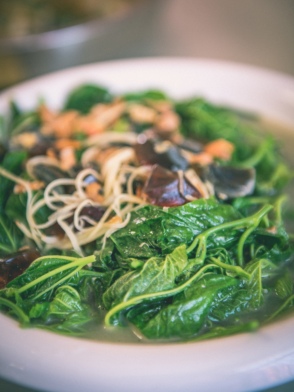 葱油猪肚是个凉菜,元荽、葱、辣椒、花生米、猪肚拌入香油,猪肚爽口,略带葱油的清香,加上酥脆的花生米,是一款很适合下酒的小菜。白盆湖盛产水库鱼,来这里自然不能错过了,大头鱼的鱼头加入蒜蓉和葱丝来清蒸,在保留鱼头的鲜味之余,蒜蓉和葱把鱼的腥气辟去,变得更加惹味。鱼头的鱼云部分入口滑溜溜的,像啫喱一样。红葱头冬菇蒸鸡是一款经典的粤菜,鸡肉非常嫩滑,又鸡味十足,店员告诉我们,从鸡到蒸鸡的荷叶,都是他们自家的农场供应的,食材好,味道自然好了。说起客家菜大家肯定第一时间想起客家酿豆腐,这里的酿豆腐煎得金黄,豆腐滑嫩,但豆腐里的肉却被剪得香酥,做得实在是完美。客家焖猪肉也是一款经典的客家菜,在客家人的餐桌上最常见到的就是这道焖猪肉了。迁居到惠州的客家人也将这道菜的做法流传出来,南方人的口味偏清淡,加入了酸菜垫底的焖猪肉肥而不腻,也很符合惠州人的口味。咸鹅的鹅也是来自他们农场的,鹅肉咸鲜美味,值得推荐!鹅也是我最爱吃的家禽,这一大碟咸鹅几乎被我一个人包办。要试出鸡的品质,一定要点白切鸡,农场的走地鸡自然不会让人失望,肉质紧致又滑,鸡皮爽脆,十分香口,一试就知是好鸡。桑叶是农场种植的,用上汤浸的烹饪方法,使原本略显粗糙的桑叶变得更好入口,吃厌了其它青菜,不妨试下这个哦。焖南瓜也是非常下饭的一道菜,软糯入味的南瓜用来拌饭,至少可以吃两碗。顺逸东方白盆湖温泉度假村