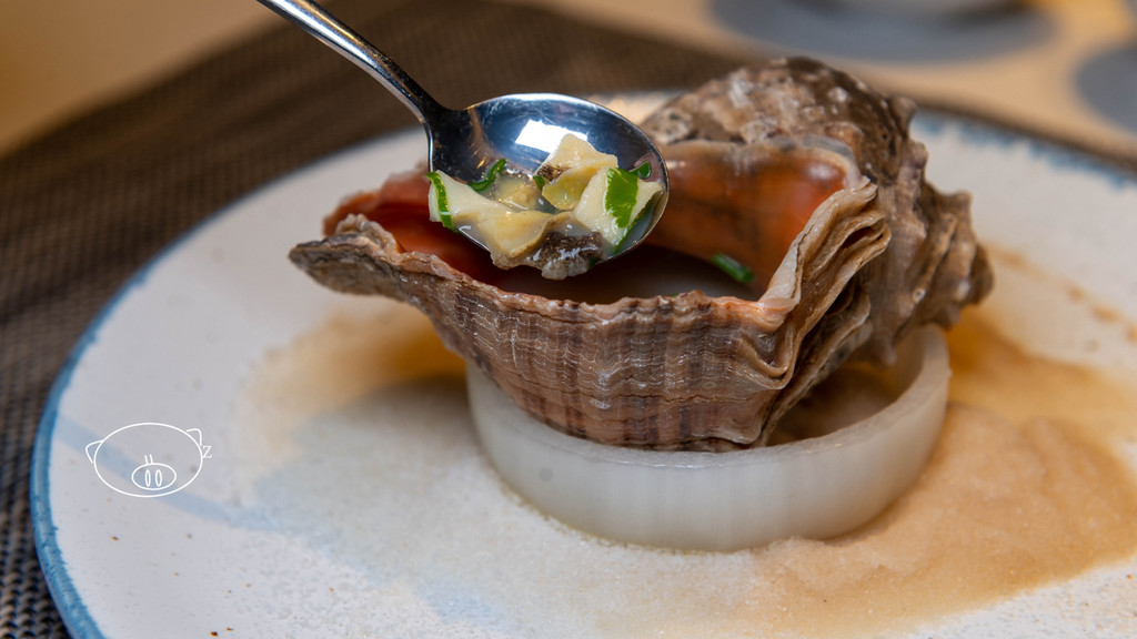 另一味回味无穷的就是火焰海螺汤,是主打招牌菜,先把海螺里面螺肉挑出来,切成一小粒小粒的煮了一锅汤,再把螺壳清洗干净,在客人面前把汤倒入螺壳内,在碟子上摆放好,把餐厅的灯关上,在海螺边上点火,香味扑鼻而来;海螺汤为了去腥味,加入了不少的胡椒粉,但喝的时候闻到胡椒味却又很鲜甜,喝完一个海螺猪猪都还想喝呢。
