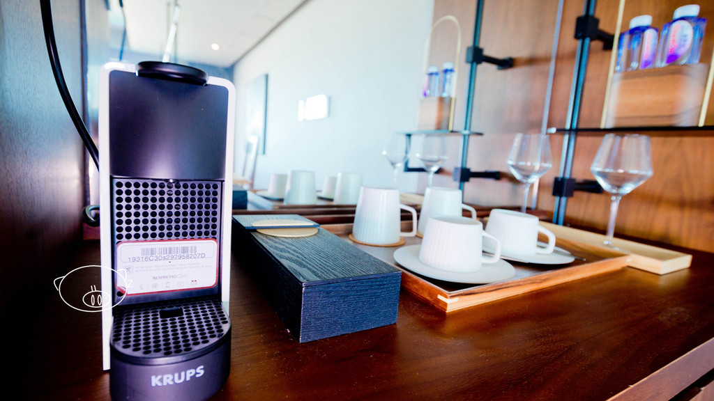 客房还配备了雀巢的胶囊咖啡机,免费的迷你吧饮料,所以喜欢喝咖啡的也有不错的选择,把咖啡、水直接调配倒进去,一杯香浓的咖啡就出来了。不爱咖啡?还有其他选择,小冰箱里有三种饮料,也是免费提供给住客饮用的。