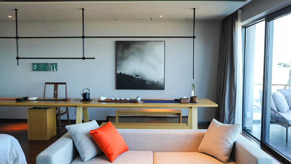 据酒店负责人介绍,檀舍临海而建,是由东仓建设创始人、著名设计师张星亲自操刀设计,占地3000多平米,总投资1一亿多仅打造了17间低奢海景套房和庭院客房,并且为了颠覆度假酒店千篇一律的入住体验,共设计了7种布局各异的户型,最大限度地将海天一色的美景引入室内,致力于实现“理想居所的窗外便是理想的风景”。