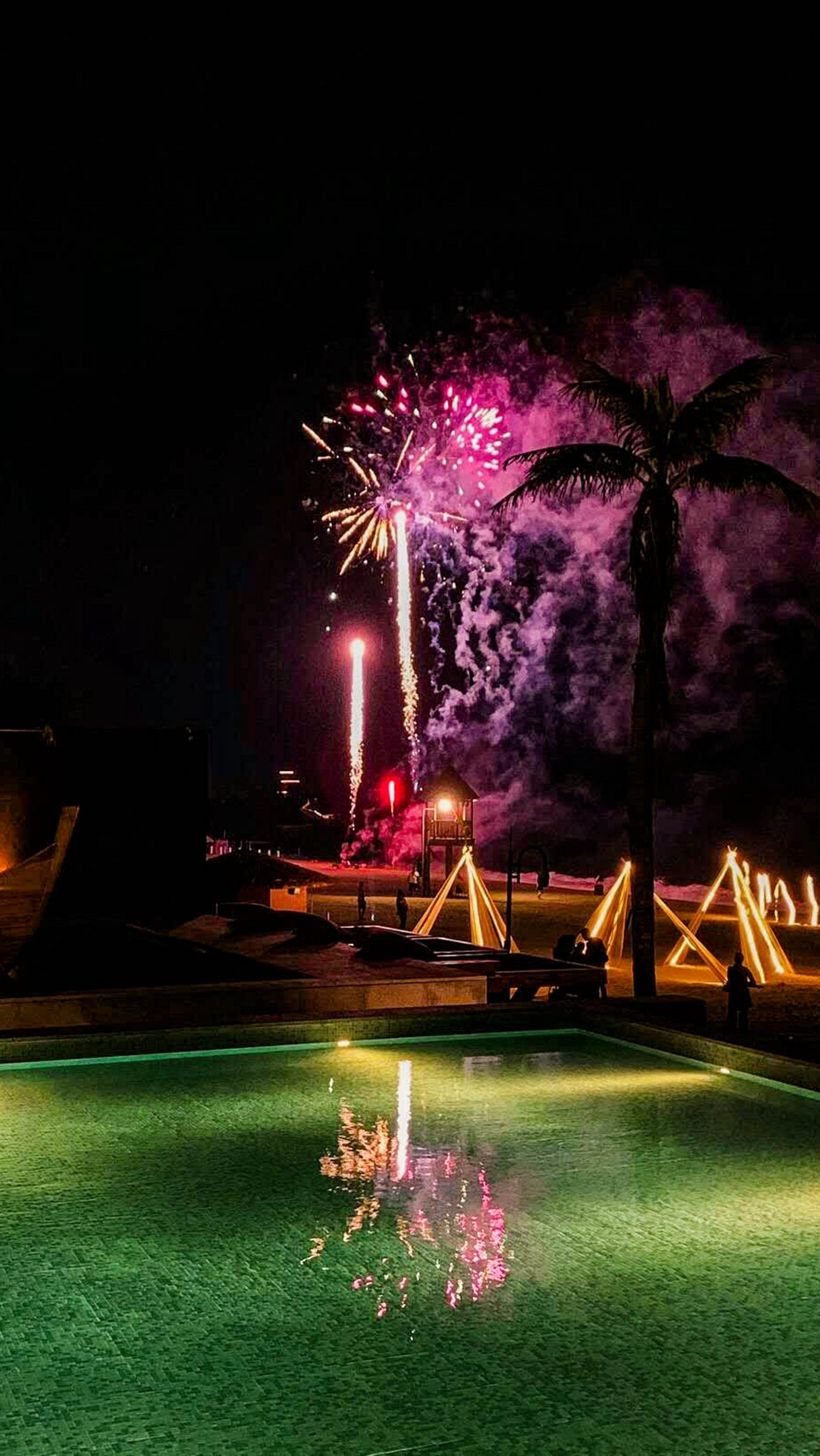 晚上可以在沙滩上放烟花,也会看到周边很多游客放的大烟花。“嘭”的一声巨响,烟花腾空而起,在天空中绽开五颜六色烟花,有的像流星徘徊在夜空,有的像万寿菊欣然怒放,还有的像仙女散花,一朵朵小花从天而降。