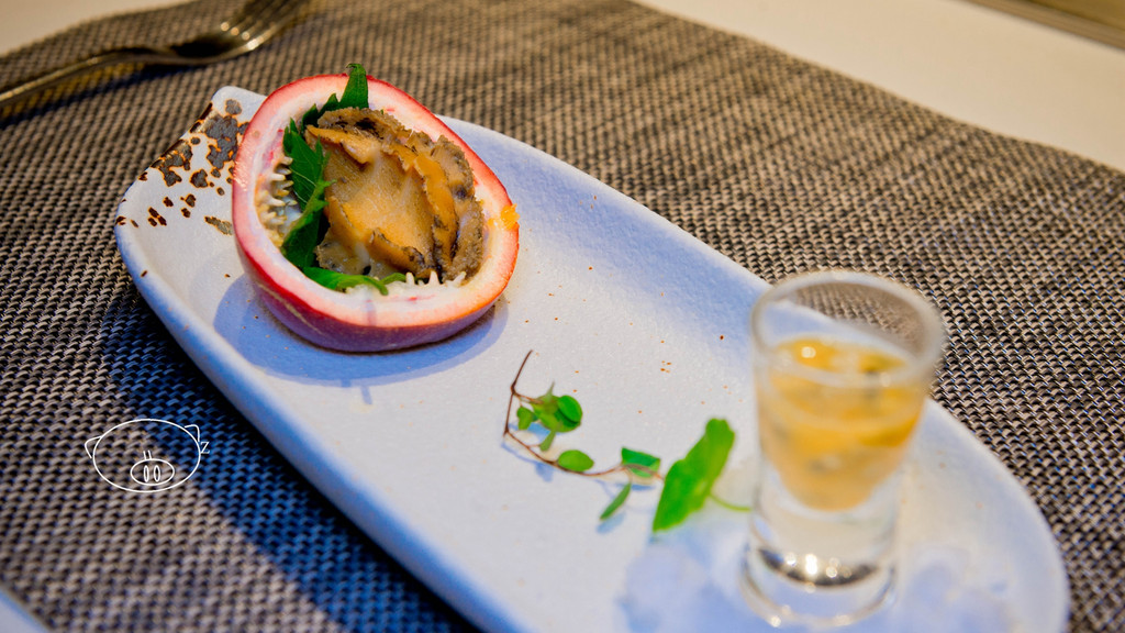 腌制过已切成一小块小块的鲍鱼躺在百香果果壳内,旁边配一杯百香果汁,这是一道前菜;