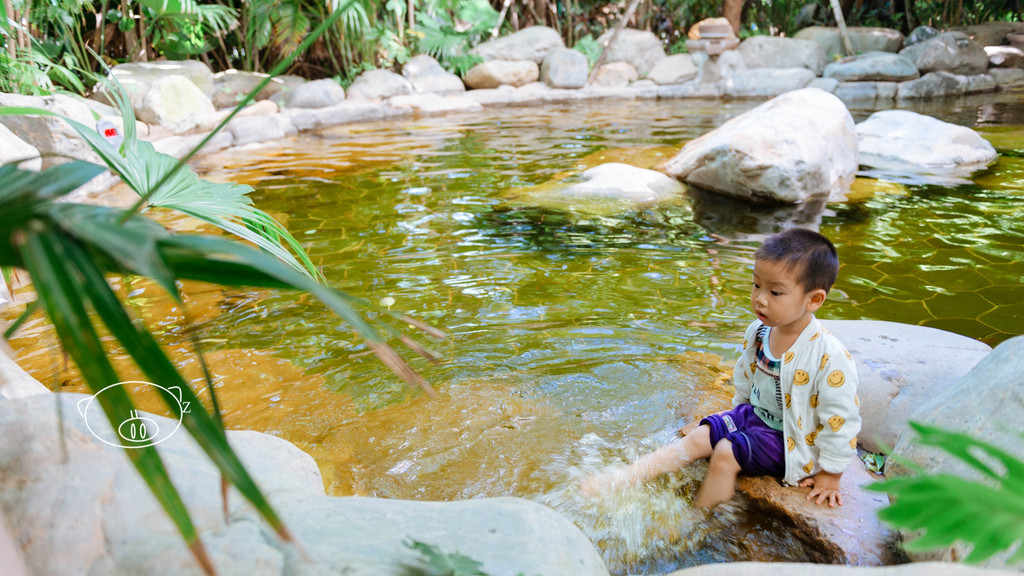 豪生有大大小小功能不同的温泉池,猪小宝太小了点,还不敢把他放进池子里泡,就泡个脚,感受感受;