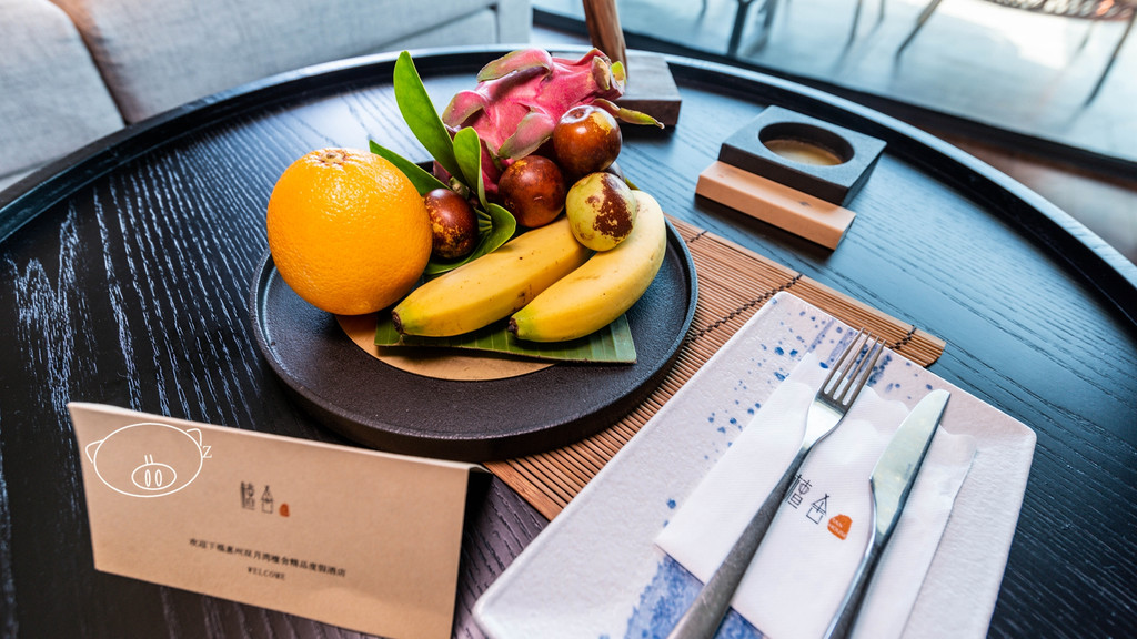 房间内的水果拼盘深受猪小宝喜爱,进房后一发现果盘就停不下口,还有一张酒店总经理签名的欢迎卡,细致温馨。