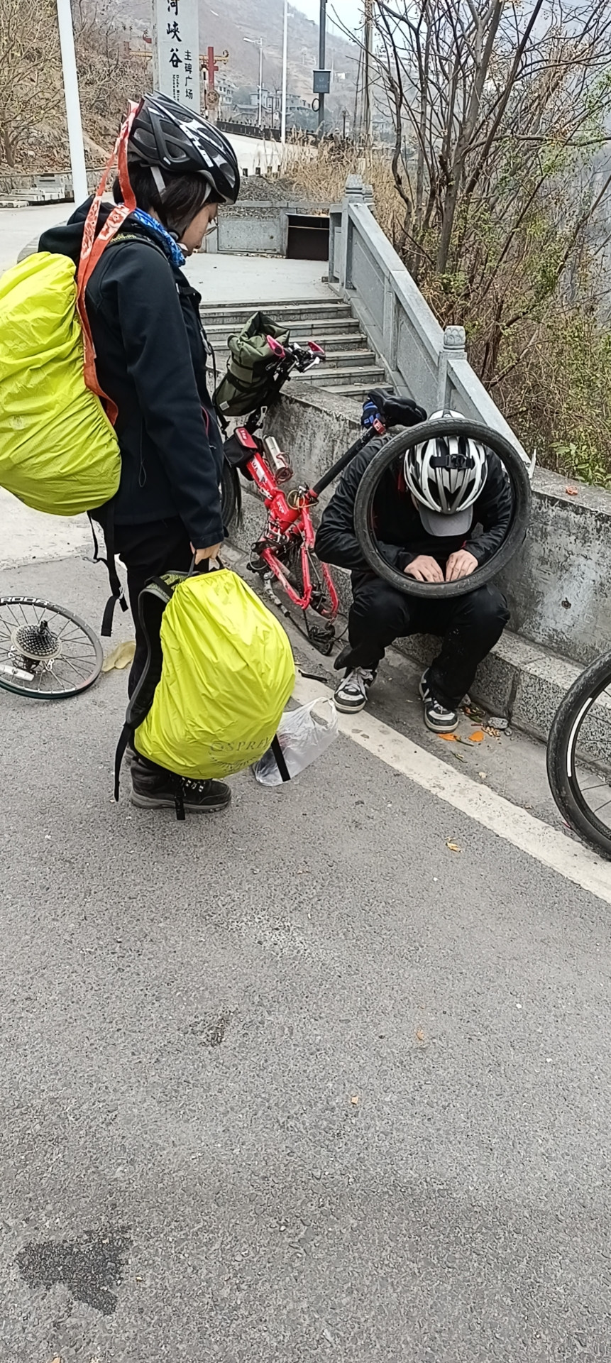 路遇坚强的骑行小兄弟,自己在弄轮胎,点赞!