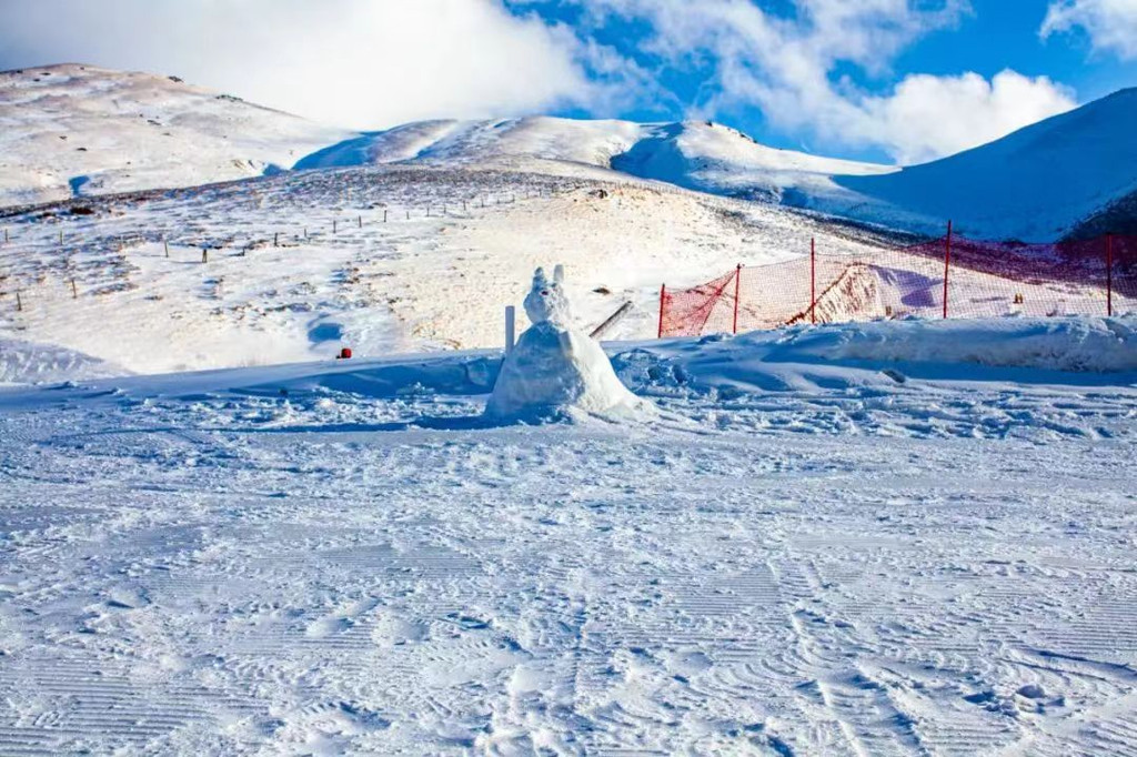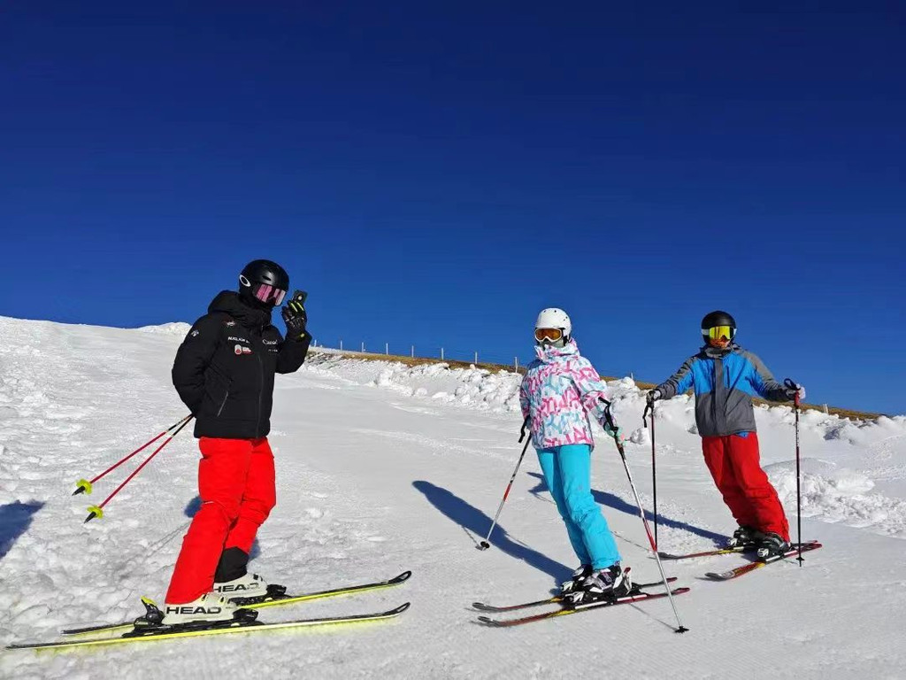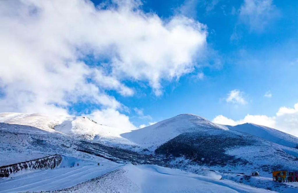 从山顶俯瞰,整个滑雪场宛如一条银白色的巨龙蜿蜒在山脉之间。在这里,你可以欣赏到壮丽的雪山、湛蓝的天空和洁白的雪地相映成趣的美丽画卷。