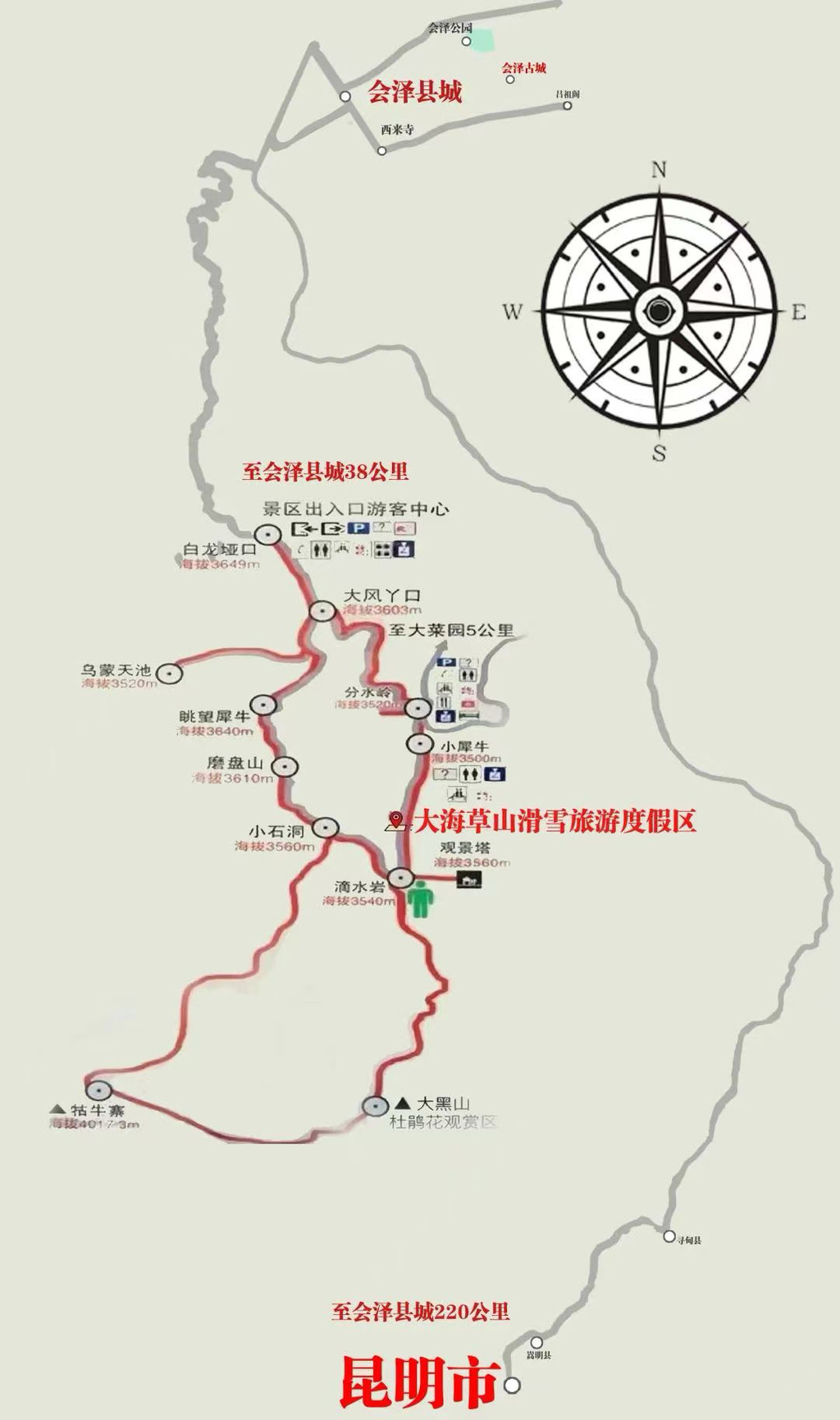 地理位置优越:滑雪场位于云南省曲靖市会泽县大海草山风景区内,交通便利,距离昆明市仅有 2-3 小时的车程。