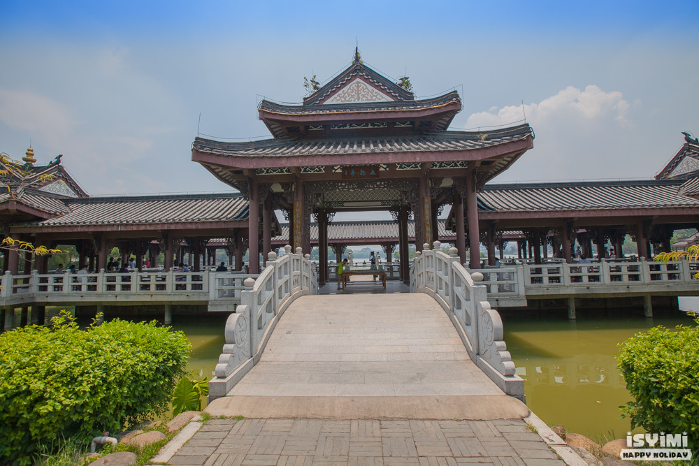由五个方形亭子组成,中间亭子最大,外檐施红色彩画,绚丽多彩。四面碧波千顷,犹如湖中琼阁