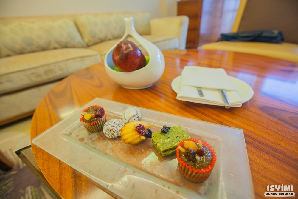 看到摆放漂亮颜色好看的小甜点和欢迎水果,也那么的精致,感官上给人愉悦的心情。