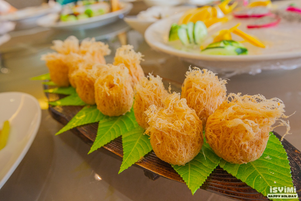 不得不提这样菜,鸟巢一样的外观,却有着甜品类的内涵,内有红薯泥等混合蛋炸制而成,但看卖相就十分抢镜。