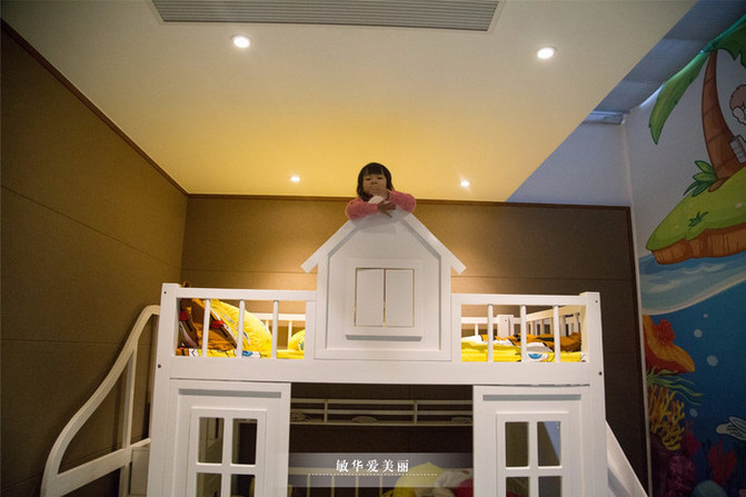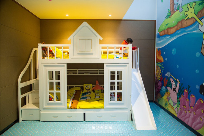 各种可爱的卡通造型墙纸、带有滑梯的子母床趣味十足。