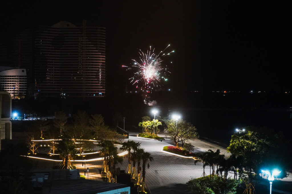 第二天我们入住的是六悦海世界,这里位于巽寮湾海边,我们住的那天刚好是元旦,外面沙滩 上海 有人在放烟花呢。
