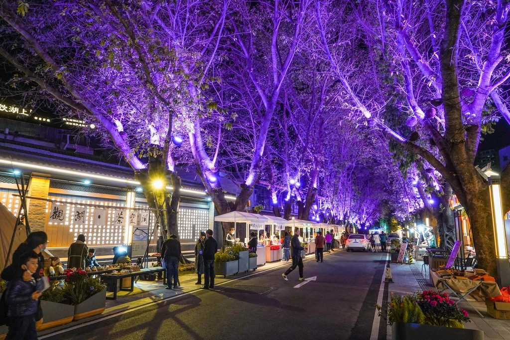 自带文艺气息的祝屋巷,道路两边的树木都点上了紫色的灯光。