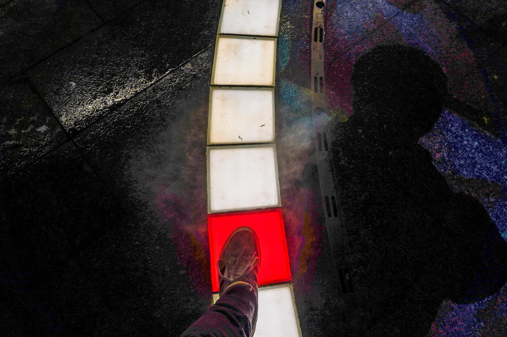 网红玻璃吊桥,上去前要穿上鞋套,其中有一段是液晶显示屏,走上去的时候,显示屏会模拟敲门裂开的效果,配上玻璃碎裂的音效,刹那间还真以为桥裂开了呢。