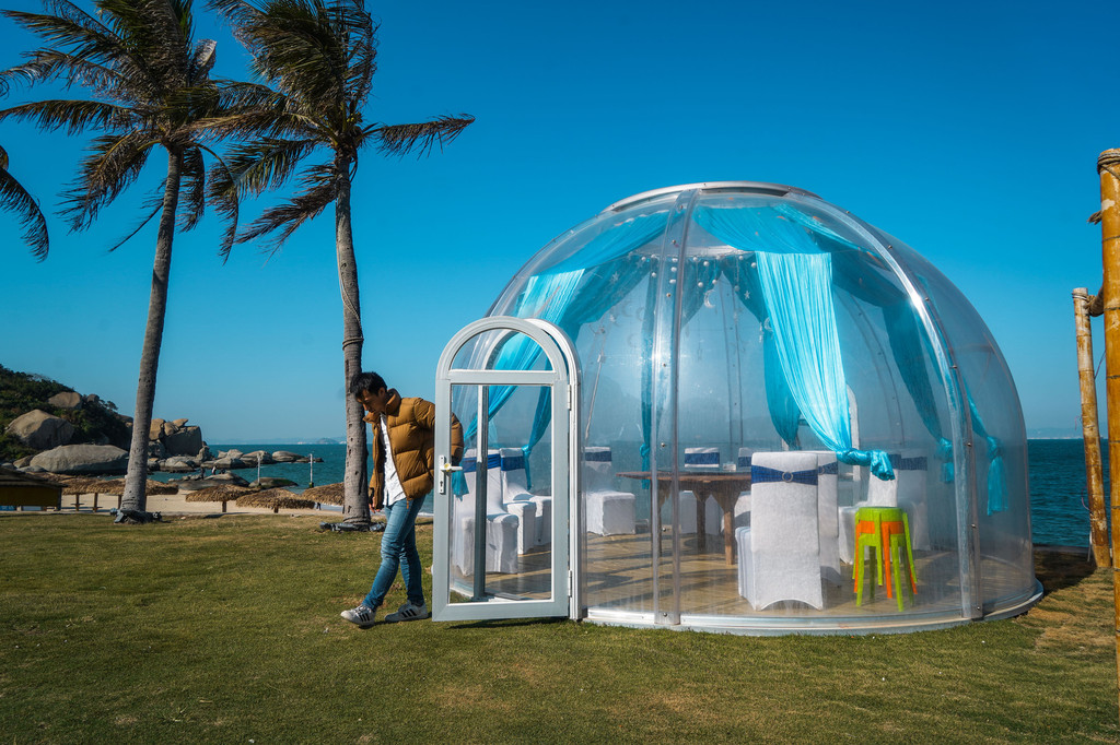 岛上还有一家民宿,就在沙滩边上。全部都是面海沙屋,出门便是沙滩。大部分房间都配有户外的面海大浴缸,亲子、情侣均可浸泡在浴缸里面朝大海,春暖花开,还有独立的透明包间,冬天在这里就餐,既可以欣赏海景,也不会觉得寒冷。听工作人员说,这家民宿还配有专业西厨,为住客提供浪漫温情的沙滩晚宴。除了浪漫的沙滩晚宴,我还发现他们在沙滩上还挂了布幕,可以在沙滩上观看电影。
