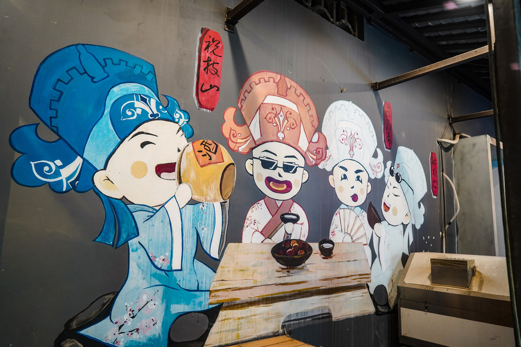 这里的壁画也很可爱,还有 江南 四大才子祝枝山,唐伯虎,文征明,徐祯卿,哈哈!让人也想像壁画里一样,约上三五好友,在这里喝喝酒聊聊天。