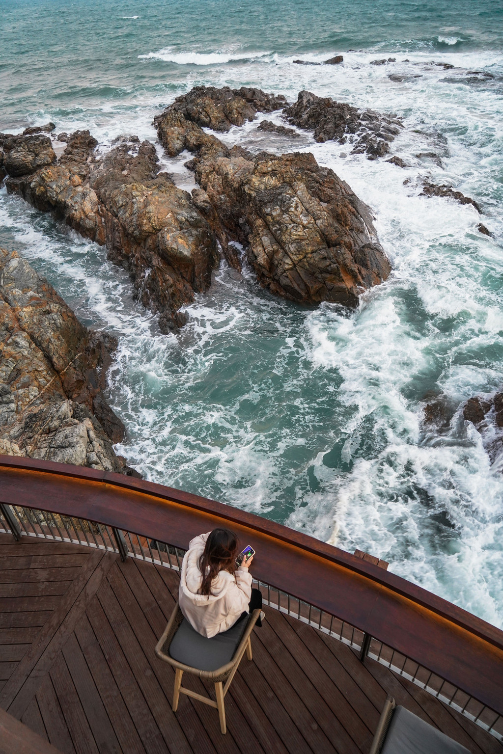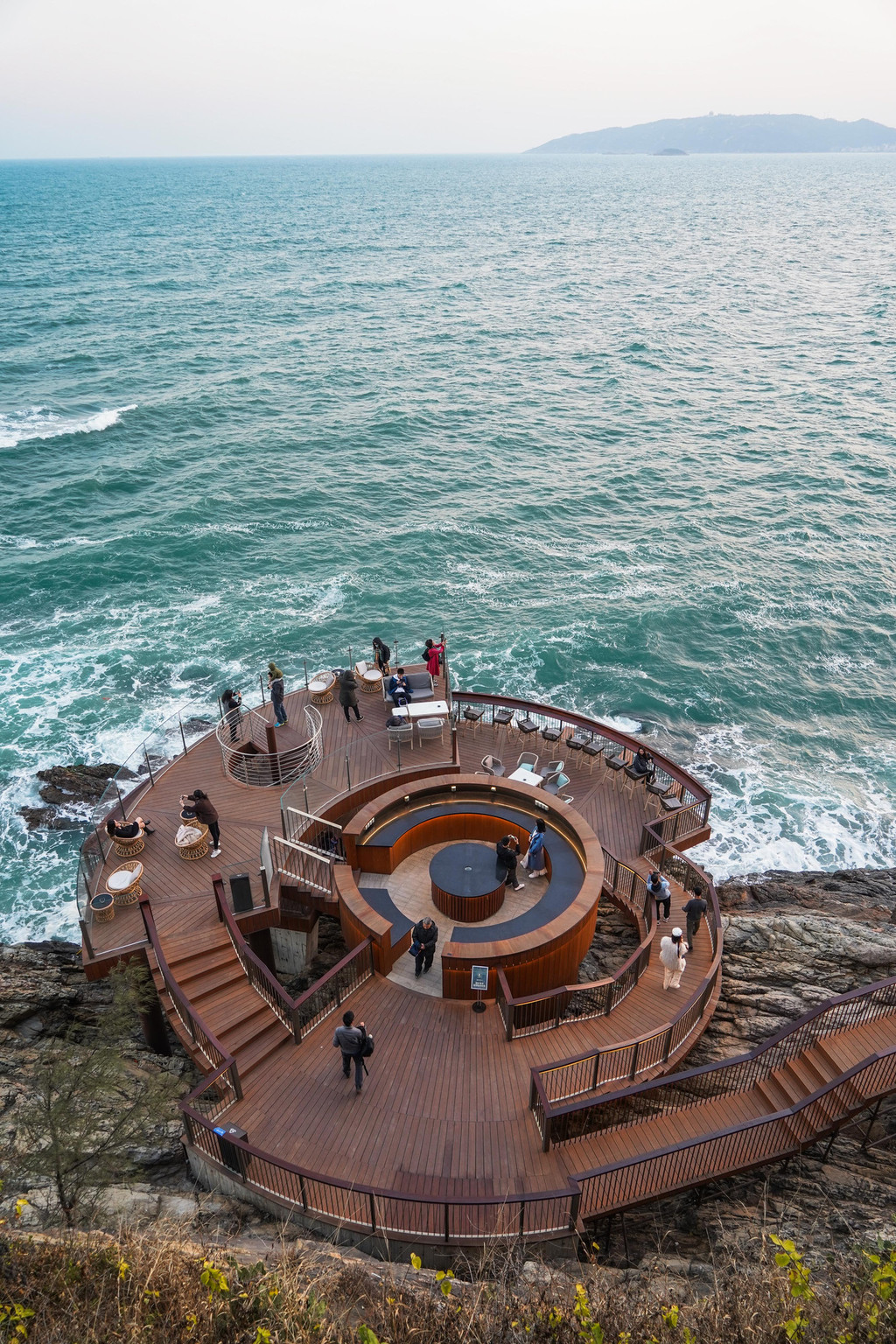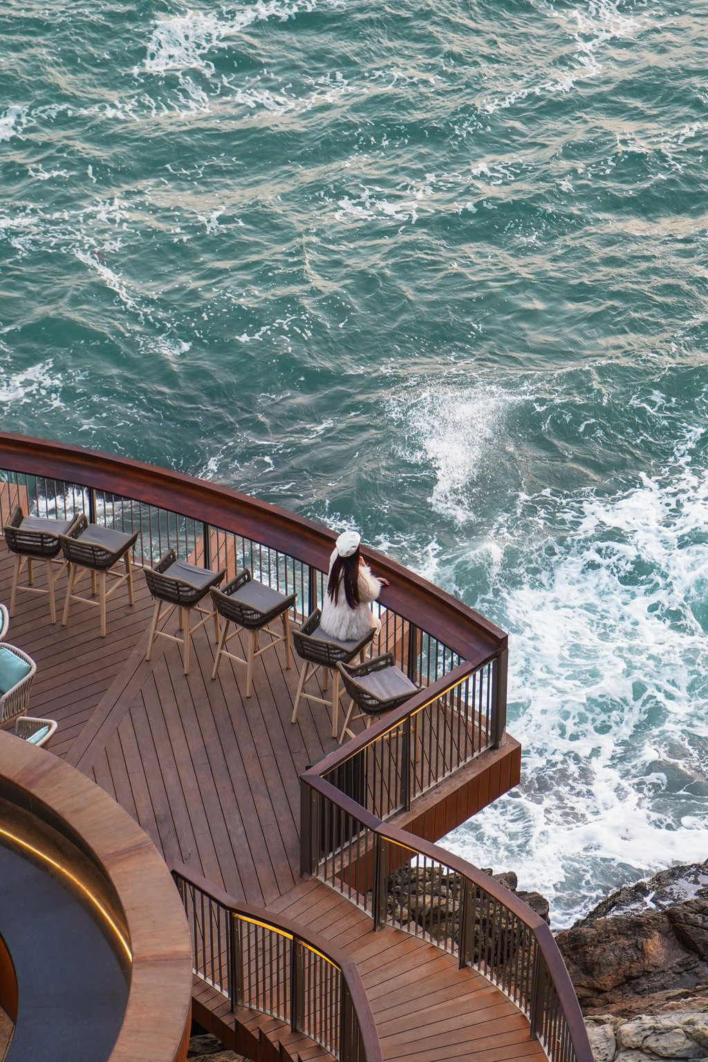 我发现这次 惠州 之旅有太多值得打卡的网红拍照地了, 比如 这个礁石酒吧,这个酒吧就建在礁石上,一半是海水,一半是悬崖,这么独一无二的风景,设计美感和环境融合得天衣无缝,据说这里的设计,是由原班团队 美国 威尔逊设计公司,以世界级标准打造的酒吧,被大家称为“ 巴厘岛 ”同款。