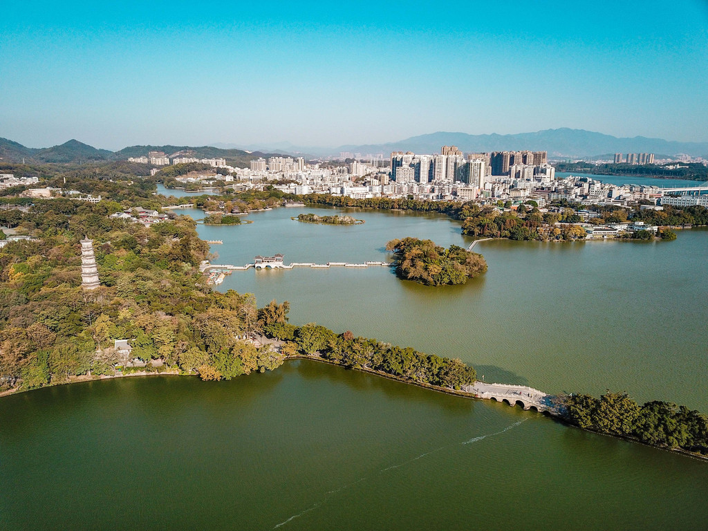 中国 有三大西湖, 杭州 西湖, 惠州 西湖,还有 安徽 的颍州西湖,这三个地方都因为北宋大文学家苏东坡曾在这里当过官,因此而出名。最为人熟悉的莫过于 杭州 西湖,但是原来 惠州 的西湖一点也不亚于 杭州 的。 惠州 西湖面积辽阔,湖岸弯环曲折,湖上洲屿点缀、三面青山环抱。湖泊东西最宽处达4公里,南北最长达6公里,面积最大时有10平方公里,湖区面积约80平方公里。在烟波浩淼的湖面上,堤桥如带,把湖面分割成五大部分,素有“五湖六桥”之称,苏东坡也盛赞 惠州 是“山水秀邃”,而且 惠州 的西湖总面积比 杭州 的还要大。当地人说如果来 惠州 没有去过西湖,那就不算来过,这里也是 惠州 的中心城区。