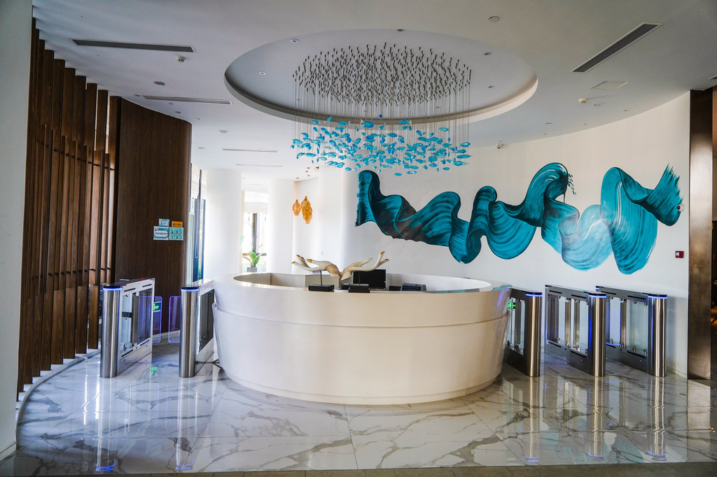 这个礁石酒吧就位于双月湾的一个楼盘内,名字叫园方东山海。到了以后要先去售楼部的营销中心,告诉他们去酒吧,然后按要求登记信息,领体验卷,乘坐观光车到达目的地。