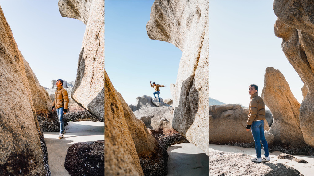 磨子石公园就在巽寮湾里面,这里真的是 惠州 新晋的网红打卡地,在各 大社 交平台上大热,随便都能刷出关于这里的笔记,因为也实在太好拍了。这里有各种造型各异的石头,怪石嶙峋,只要站在里面随手一拍,都是大片,特别适合小姐姐来这里打卡拍照,就连我这个怪叔叔,拍出来都可以媲美时尚杂志封面就可见一斑。可惜太太雪梨还在家照顾小孩,等孩子长大了,一定要带他们来这里。