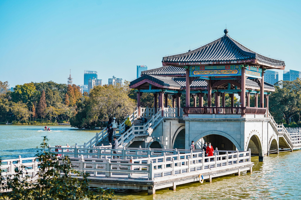 惠州 西湖作为国家5A级景点,可观赏的景点非常多,其景观有五湖、六桥、十八景组成,九曲桥、 平湖 ,苏堤玩月等等景点,如果要完整地走下来,估计要也一整天。我们几个朋友从西湖正门走进来,经过苏堤,九曲桥等,最后游览丰渚园。