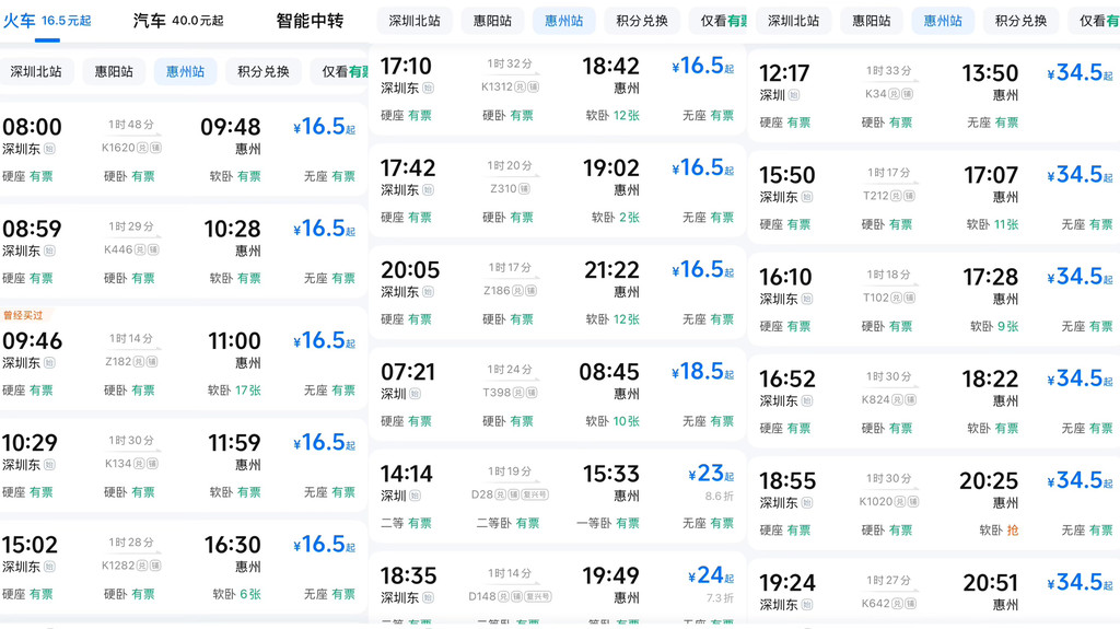 从深圳到惠州市区(专指惠城区)真是无比方便又无比便宜,虽然高铁到不了惠城区,但是超便宜的绿皮火车,每天都有好几趟,十几块到三十块任选,只不过体验感不会多好,绿皮火车嘛。