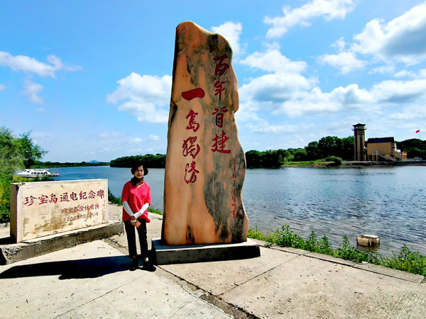 在江畔矗立着的一块巨石上“中国•虎林 珍宝岛”几个红色大字赫然醒目。站在江畔远眺,前方不远就是珍宝岛。岛上的连体建筑群为黄色,一侧高起的圆形瞭望塔上,竖排题写的“珍宝岛哨所”五个金色大字清晰可见。