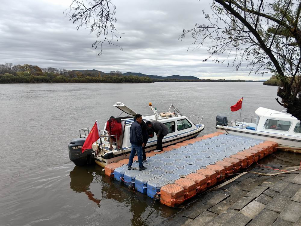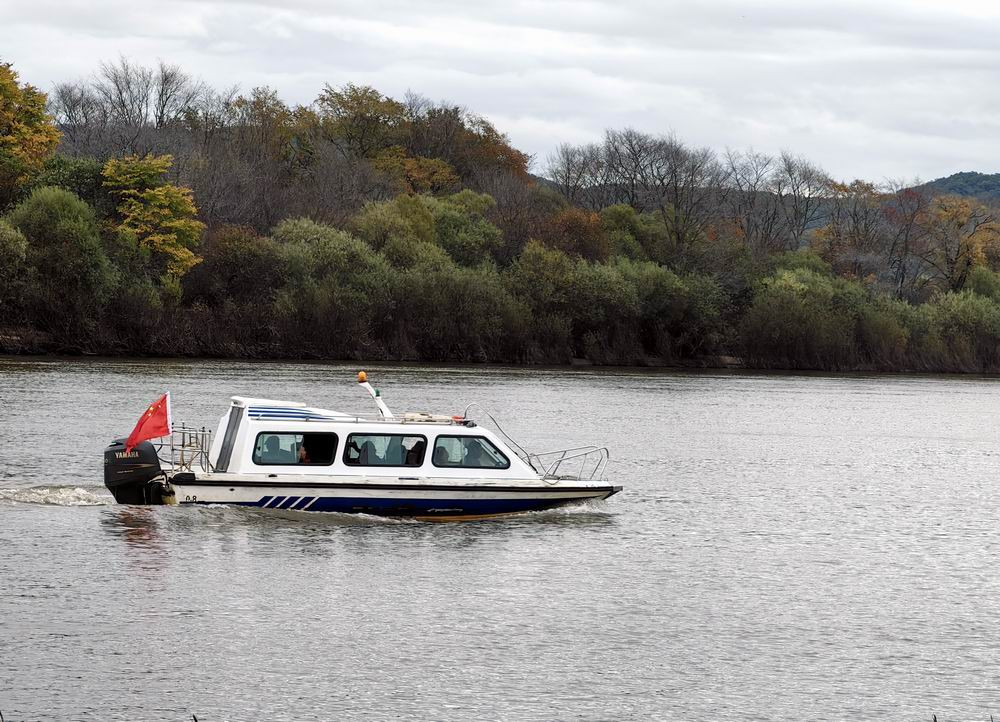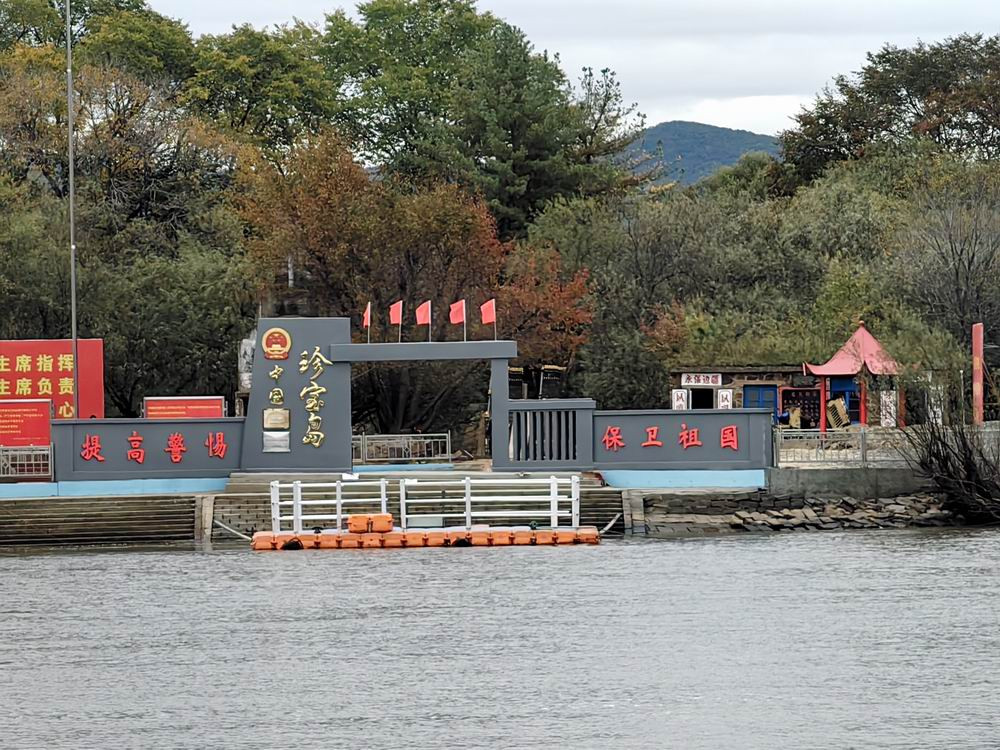 目前的珍宝岛驻扎有守备部队,还未对游客开放。因此,只能远眺。图为远眺珍宝岛哨所。