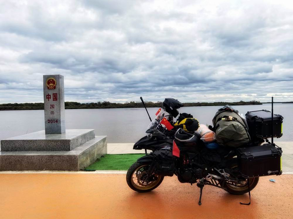 乌苏里江岸边界碑旁的自驾游摩托车。
