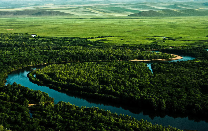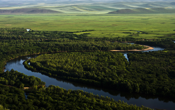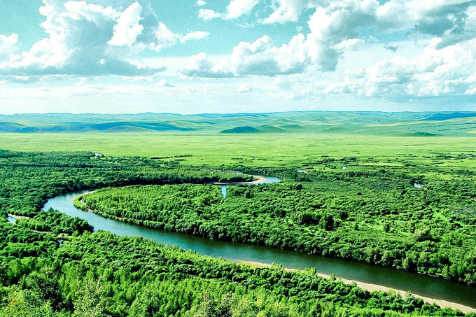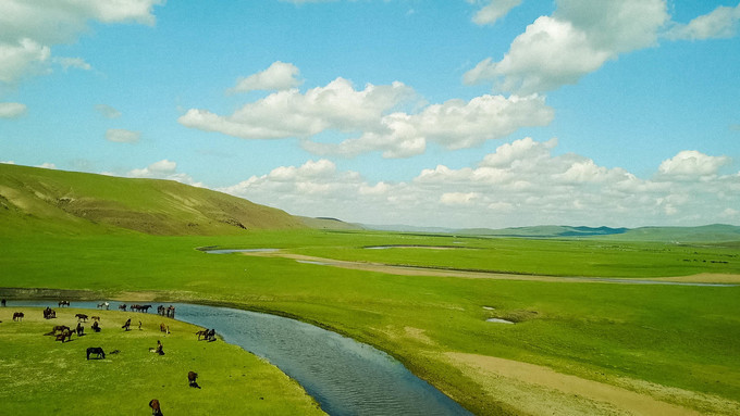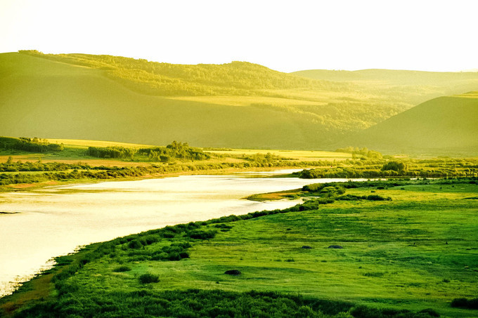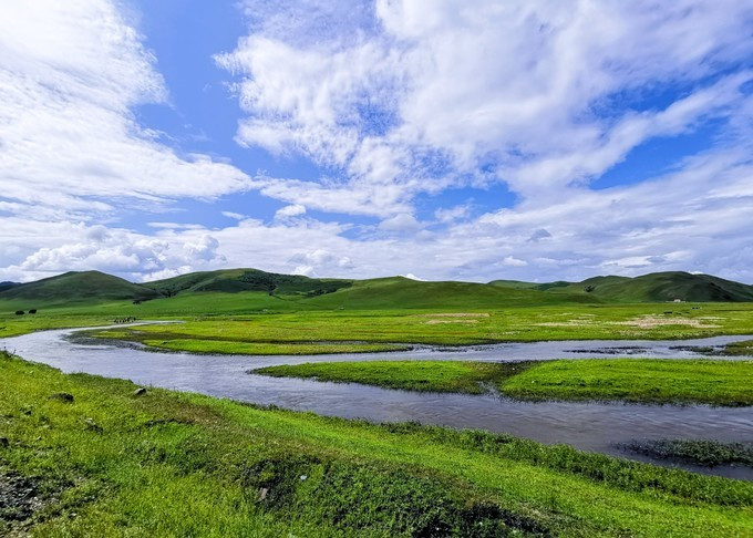 为照片关联地点河水在草原上蜿蜒流淌,滋润着草原,植被郁郁葱葱