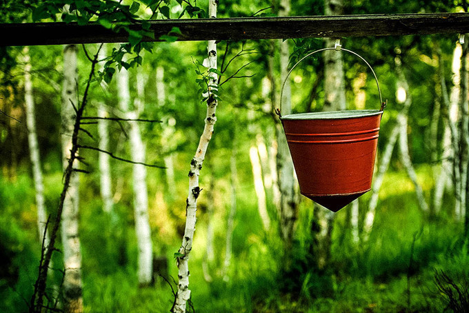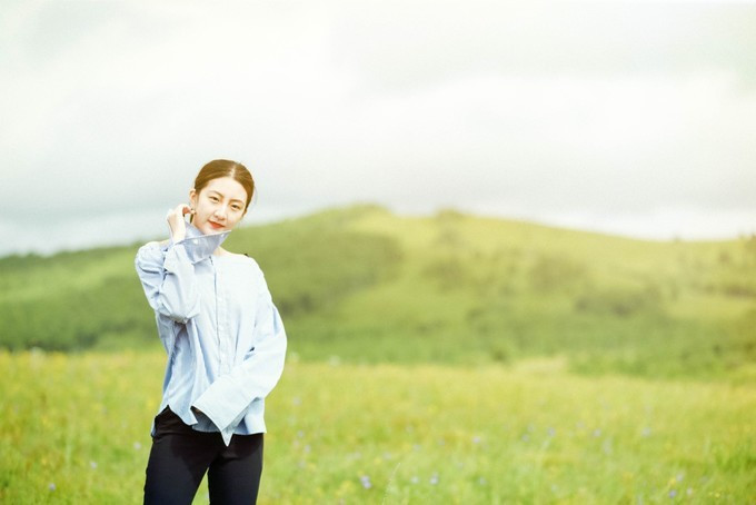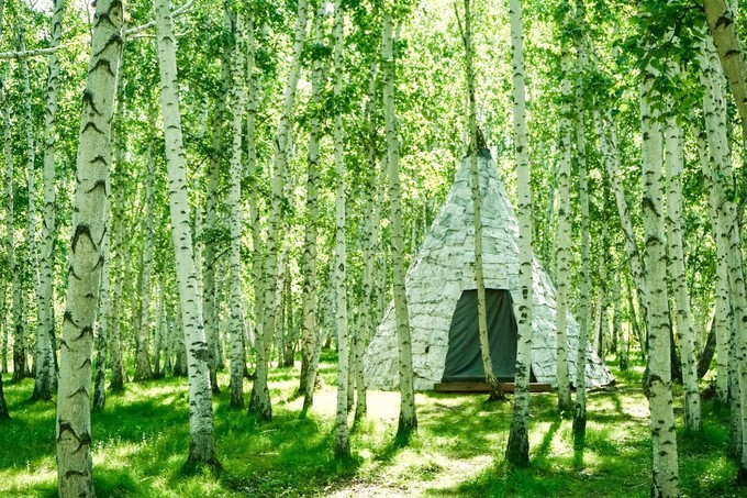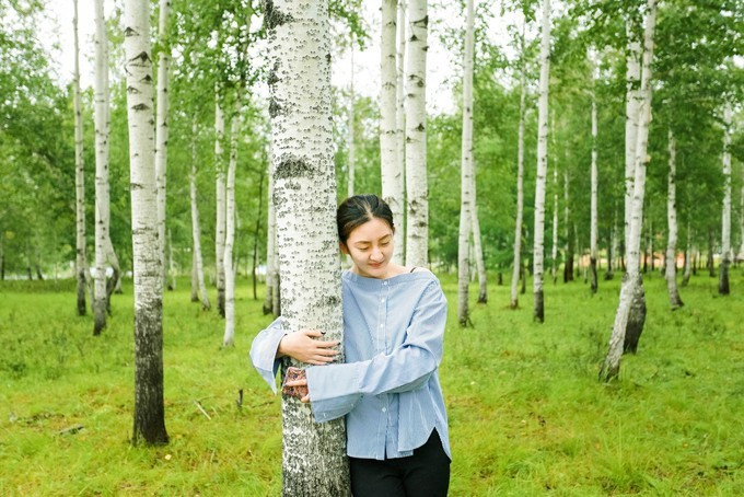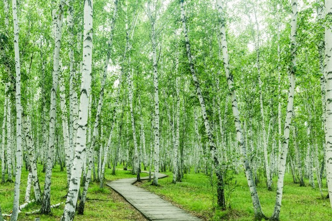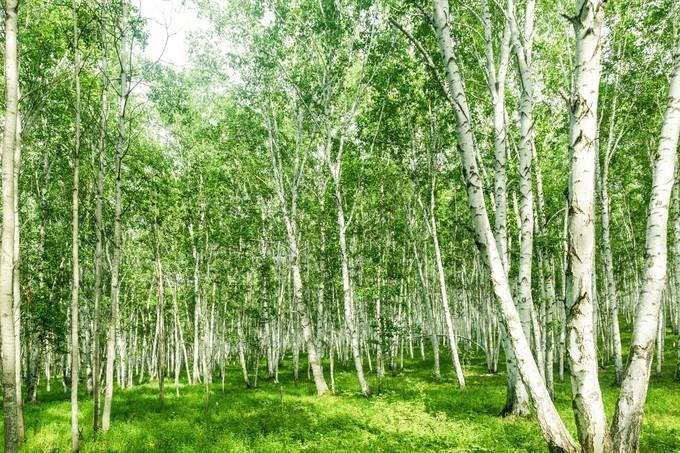 为照片关联地点步行至白桦林中。 这里绿色的树叶和白色的树干,构成了满眼绿色的美景。