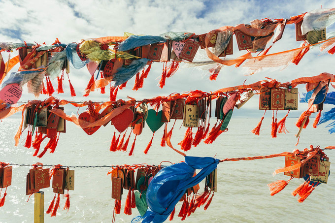 为照片关联地点湖畔挂满了祈祷牌,它们正随着经幡飘扬。
